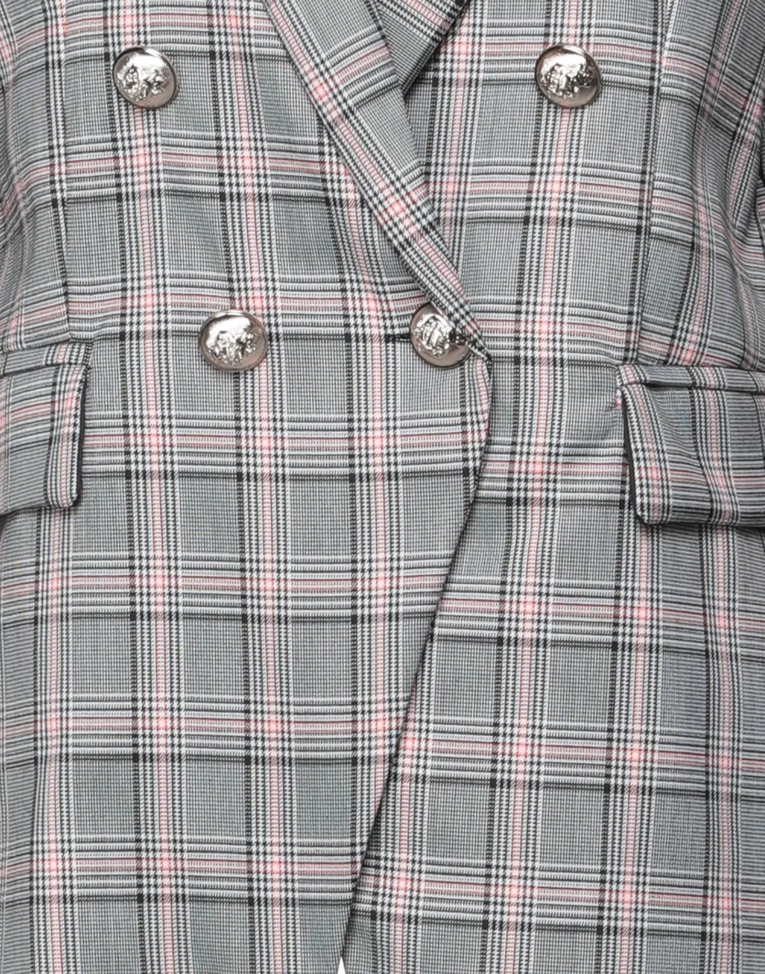 plain weave, no appliqués, glen plaid, double-breasted, lapel collar, long sleeves, fully lined, button closing, multipockets, stretch
