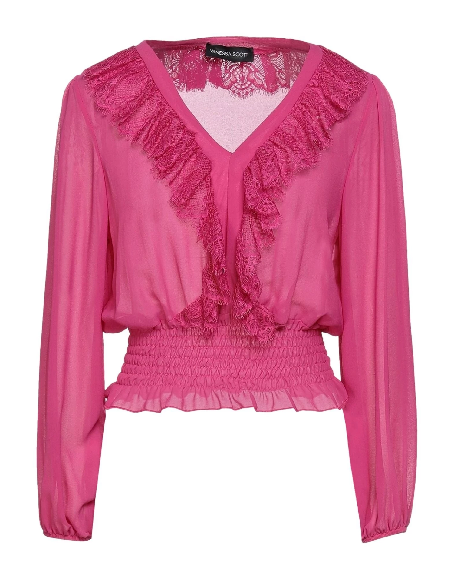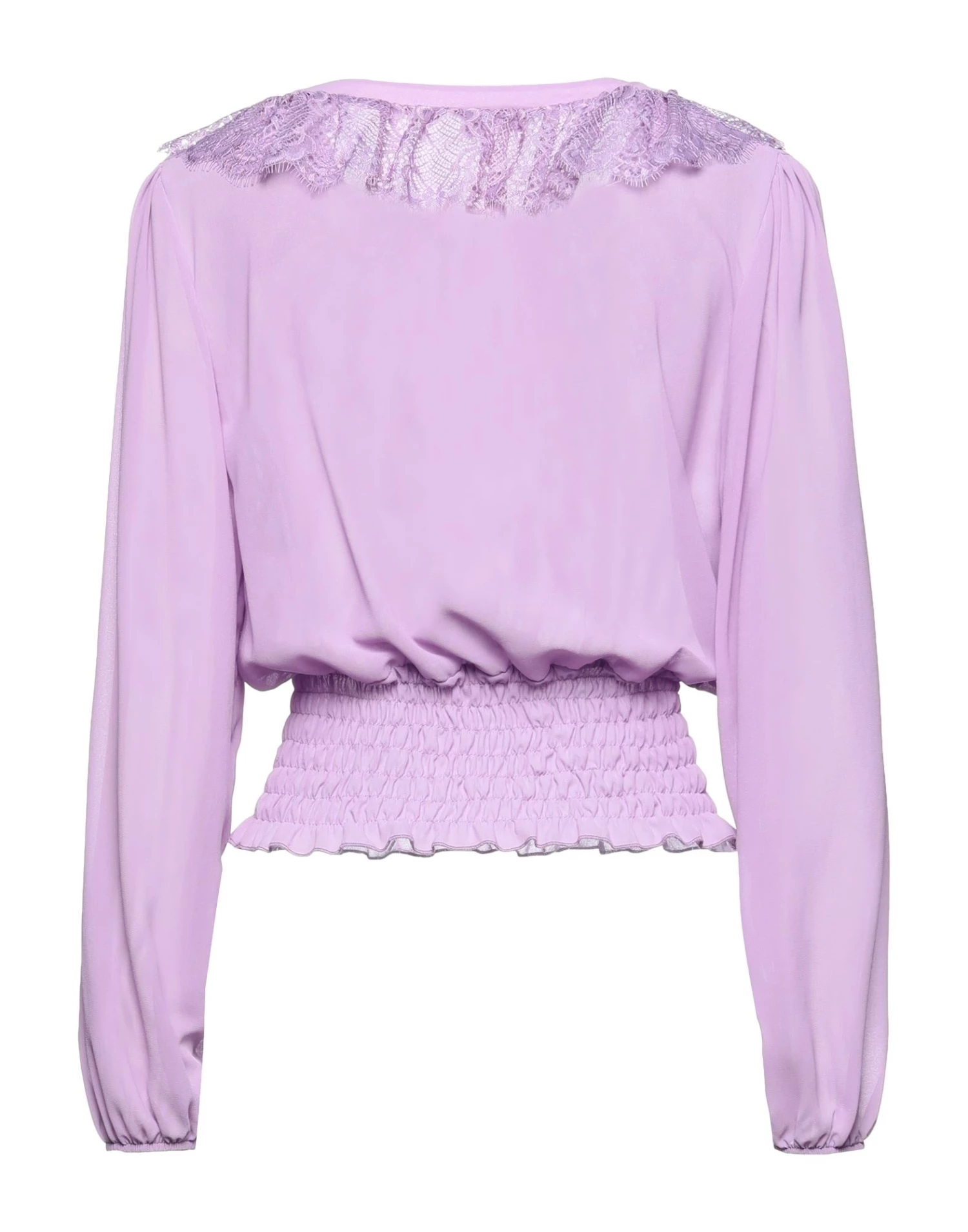 lace, crepe, frills, ruffles, solid colour with appliqués, v-neck, long sleeves, no pockets