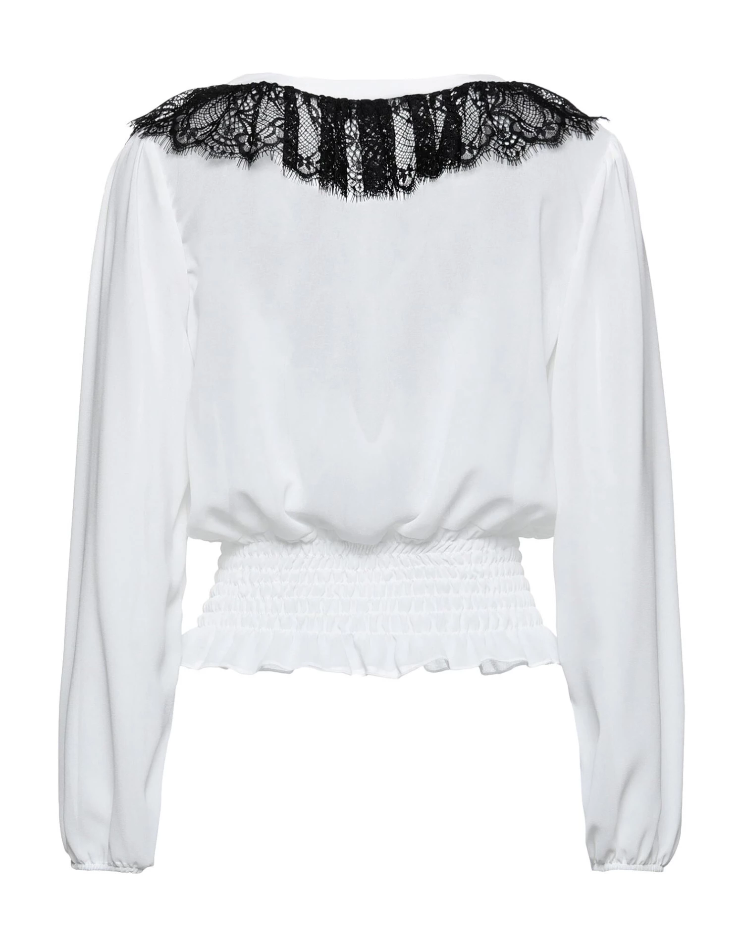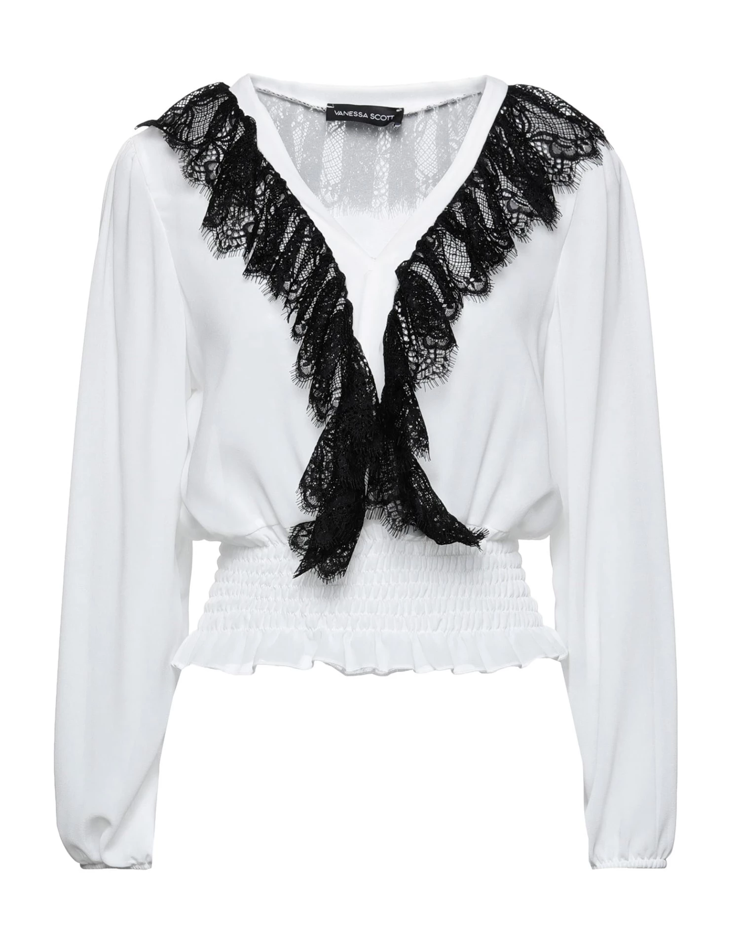lace, crepe, ruffles, frills, two-tone, v-neck, long sleeves, no pockets