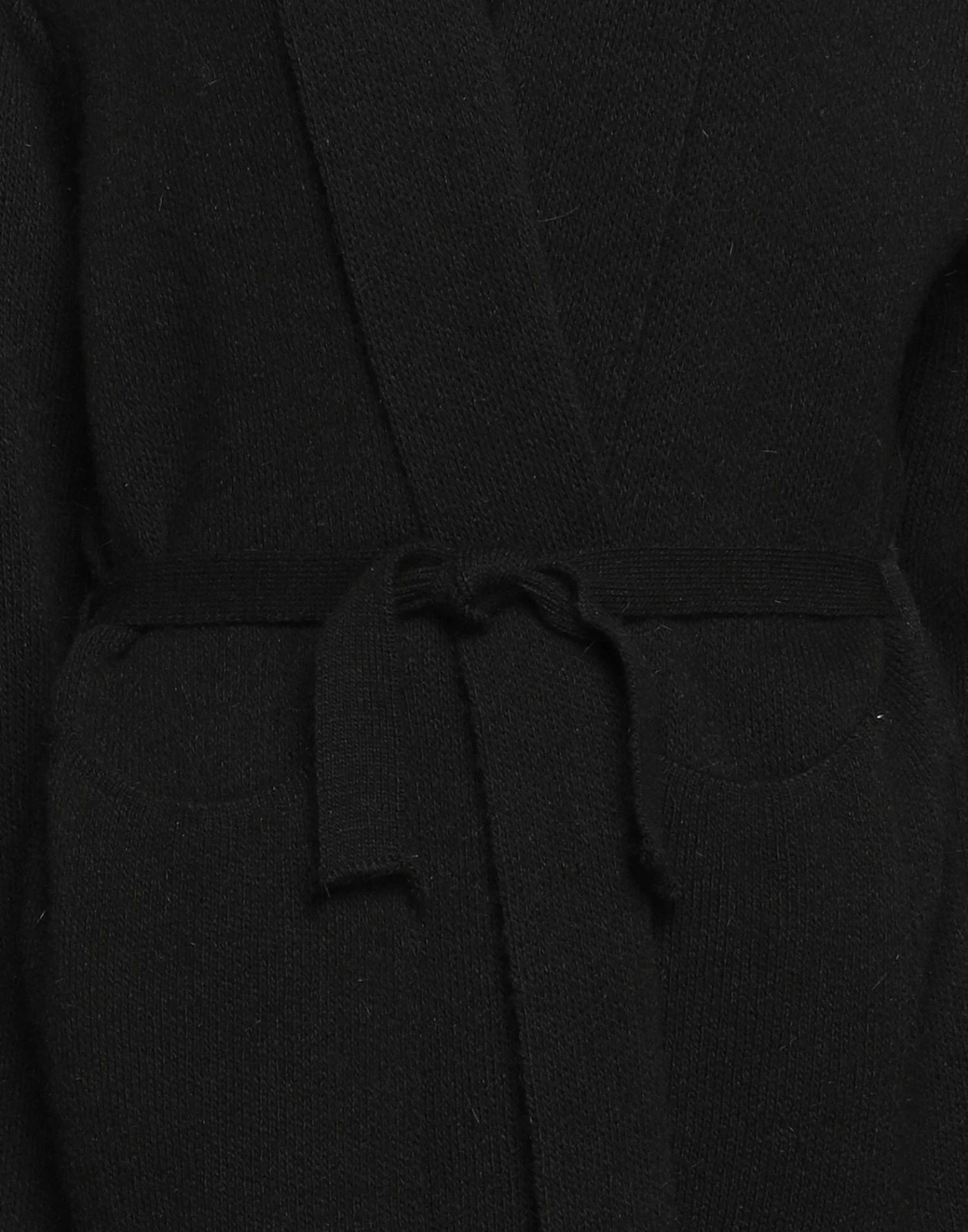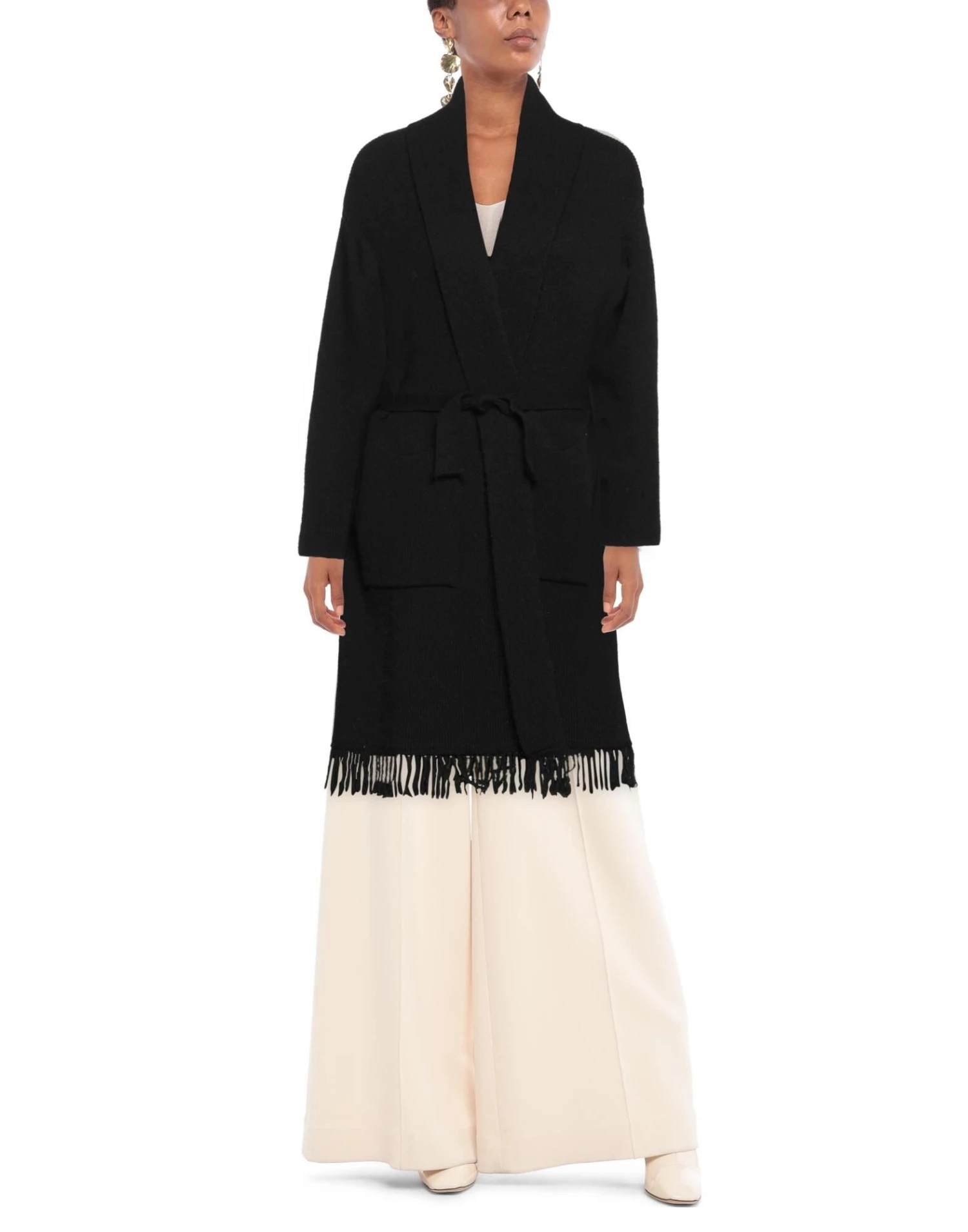 knitted, lightweight knit, fringes, belt, solid color, deep neckline, long sleeves, multipockets