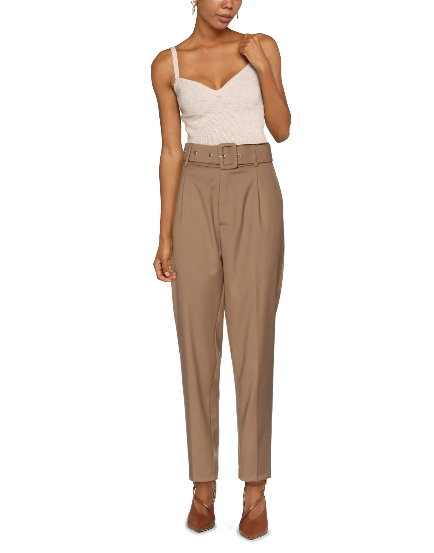 twill, belt, solid color, high waisted, tapered leg, regular fit, button closing, zipper closure, multipockets, stretch