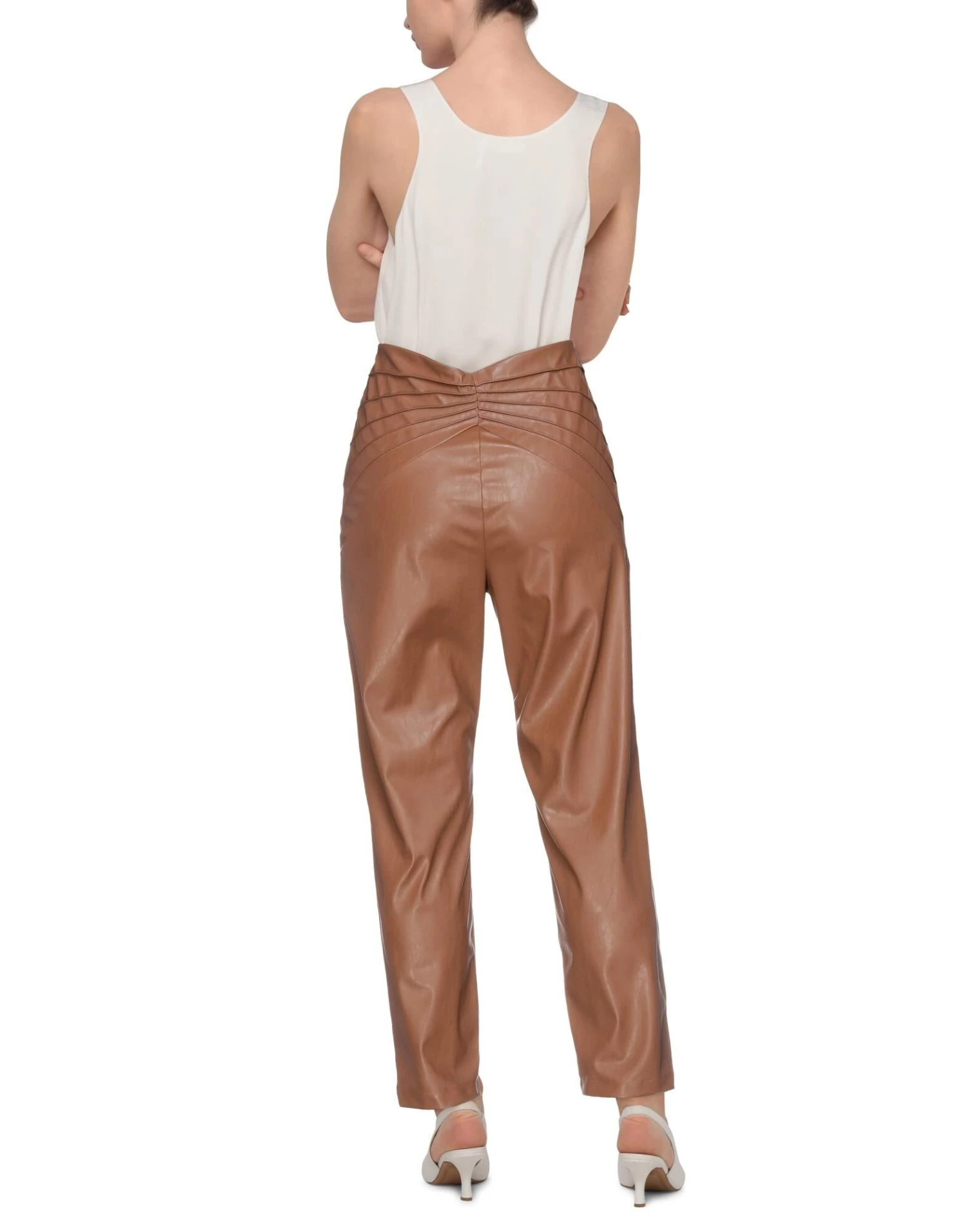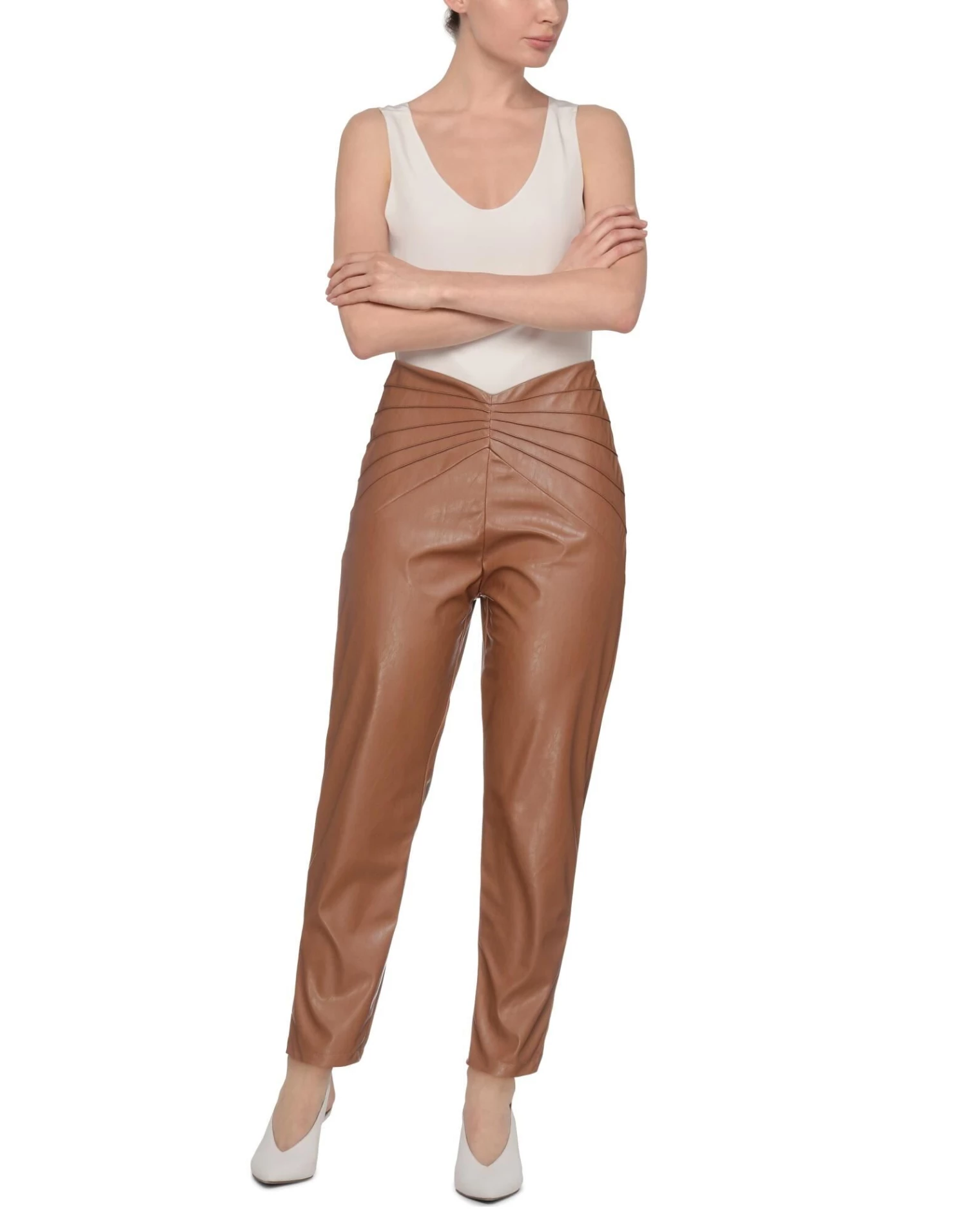 coated fabric, basic solid color, no appliqués, slim fit, high waisted, tapered leg, zipper closure