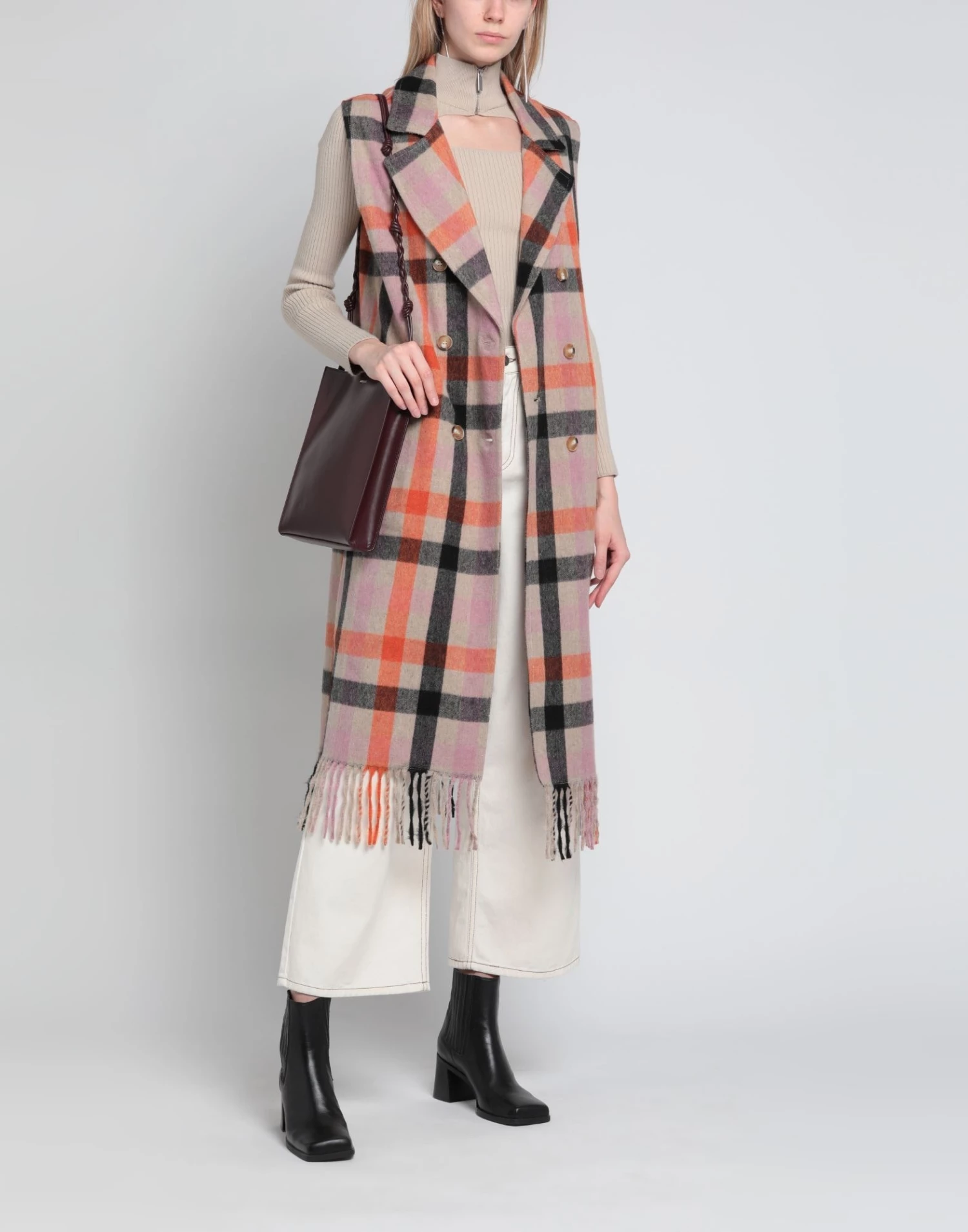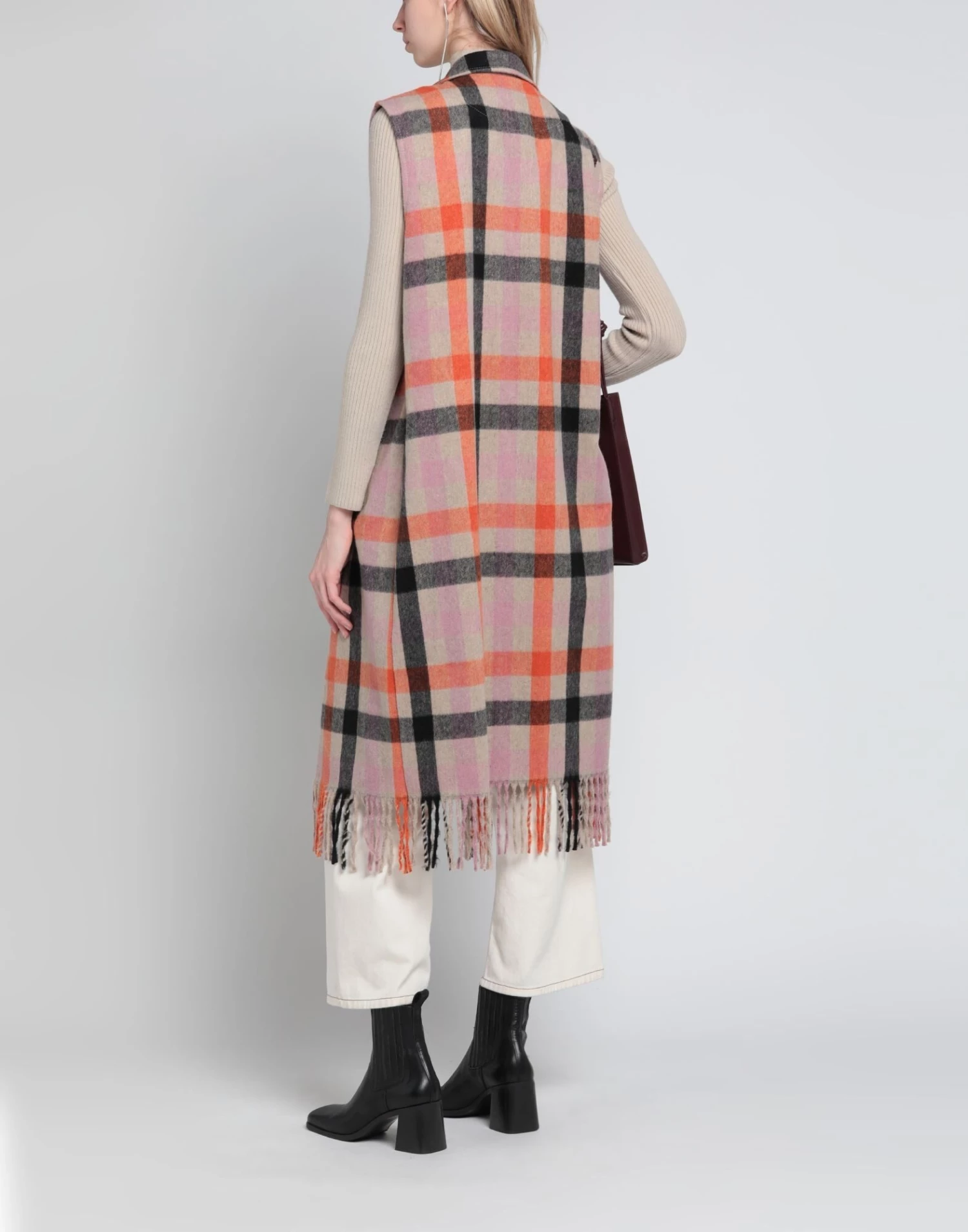 flannel, no appliqués, checked, lapel collar, double-breasted, sleeveless, unlined, button closing, multipockets, fringed hem, stretch