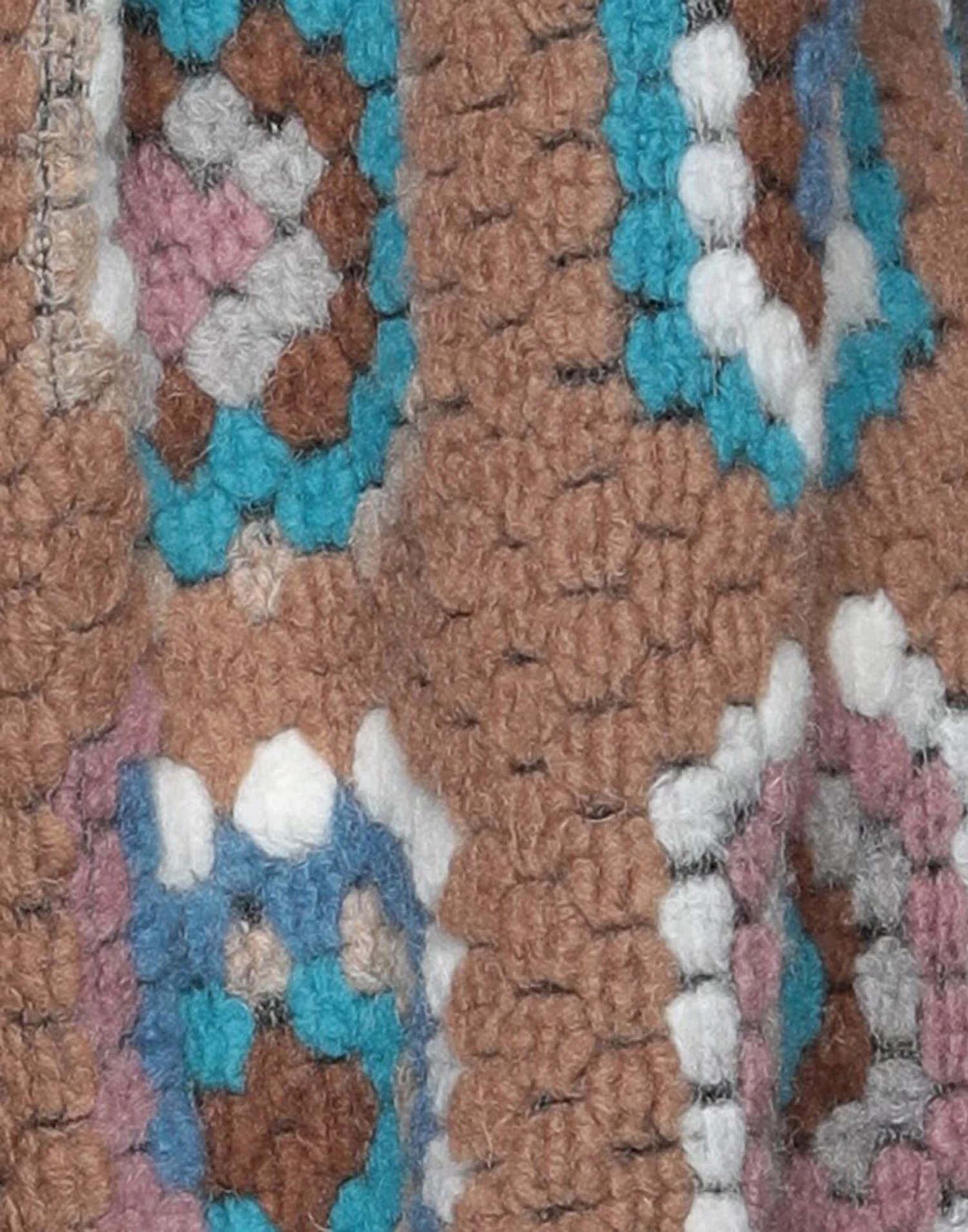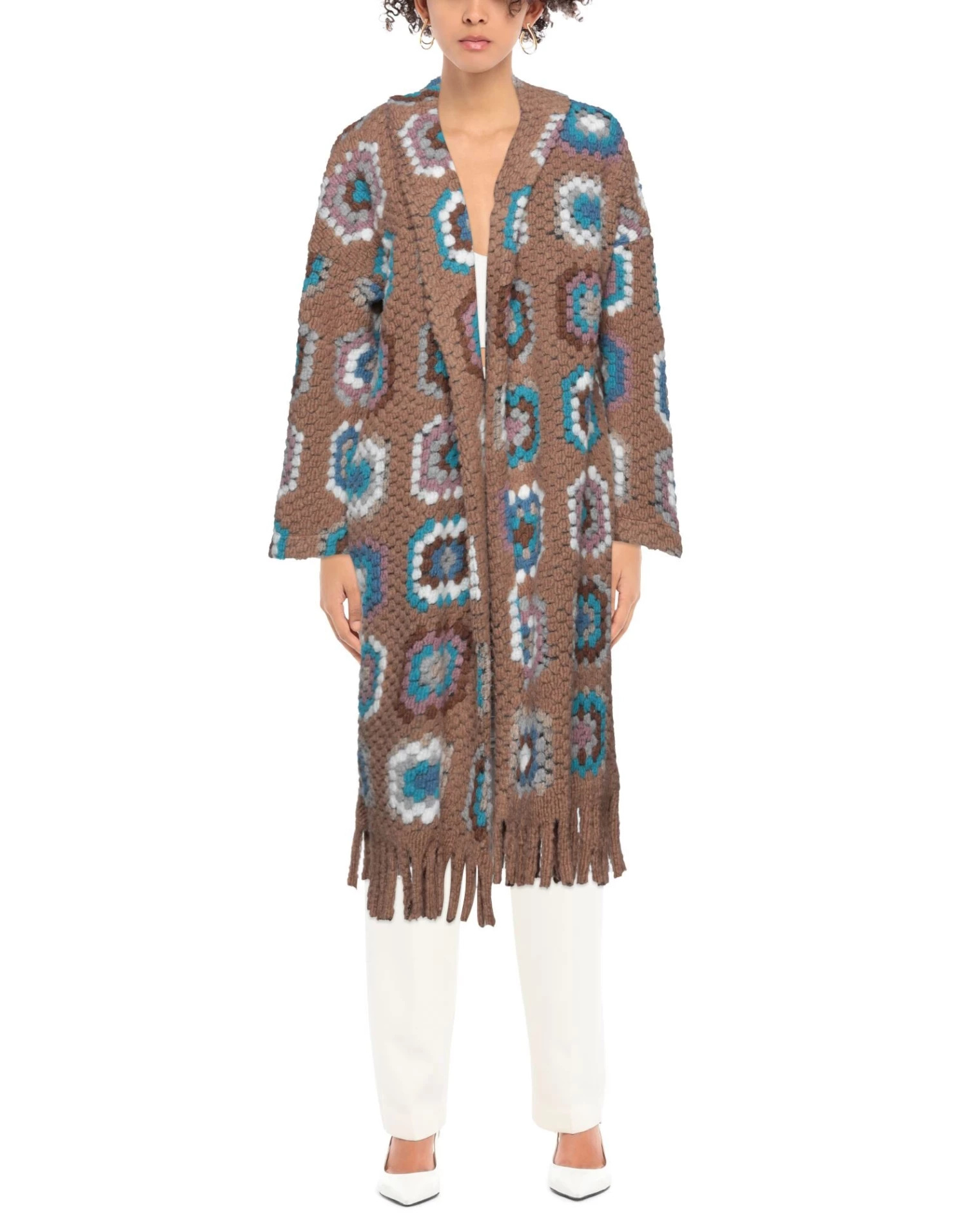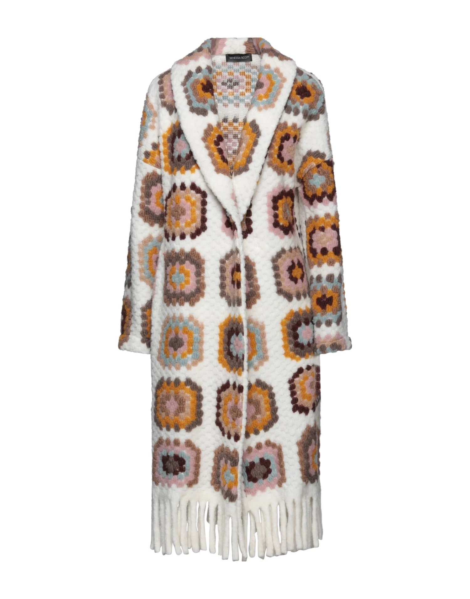 knitted, bouclé, medium-weight knit, no appliqués, multicolor pattern, deep neckline, single-breasted , long sleeves, unlined, no pockets, fringed hem