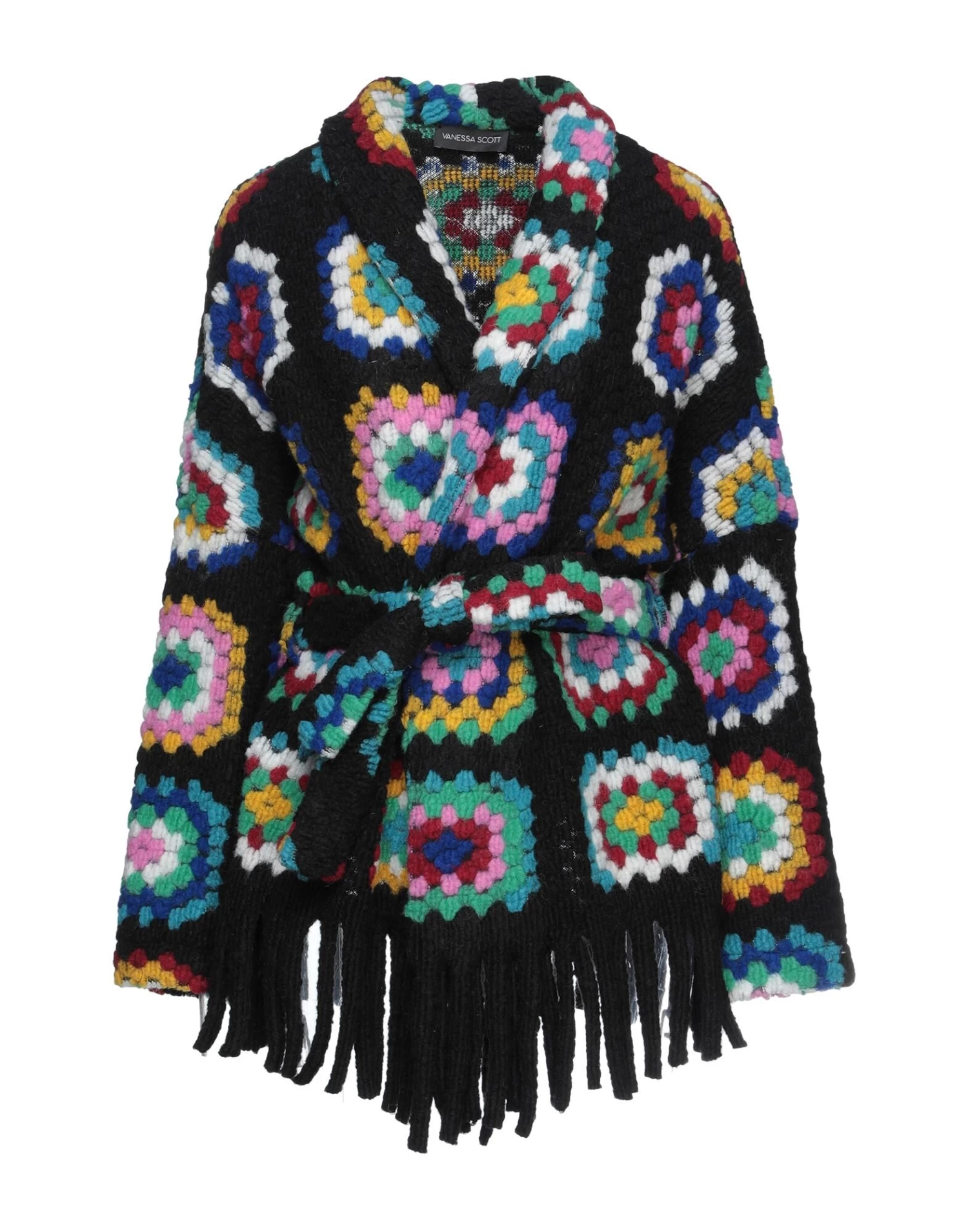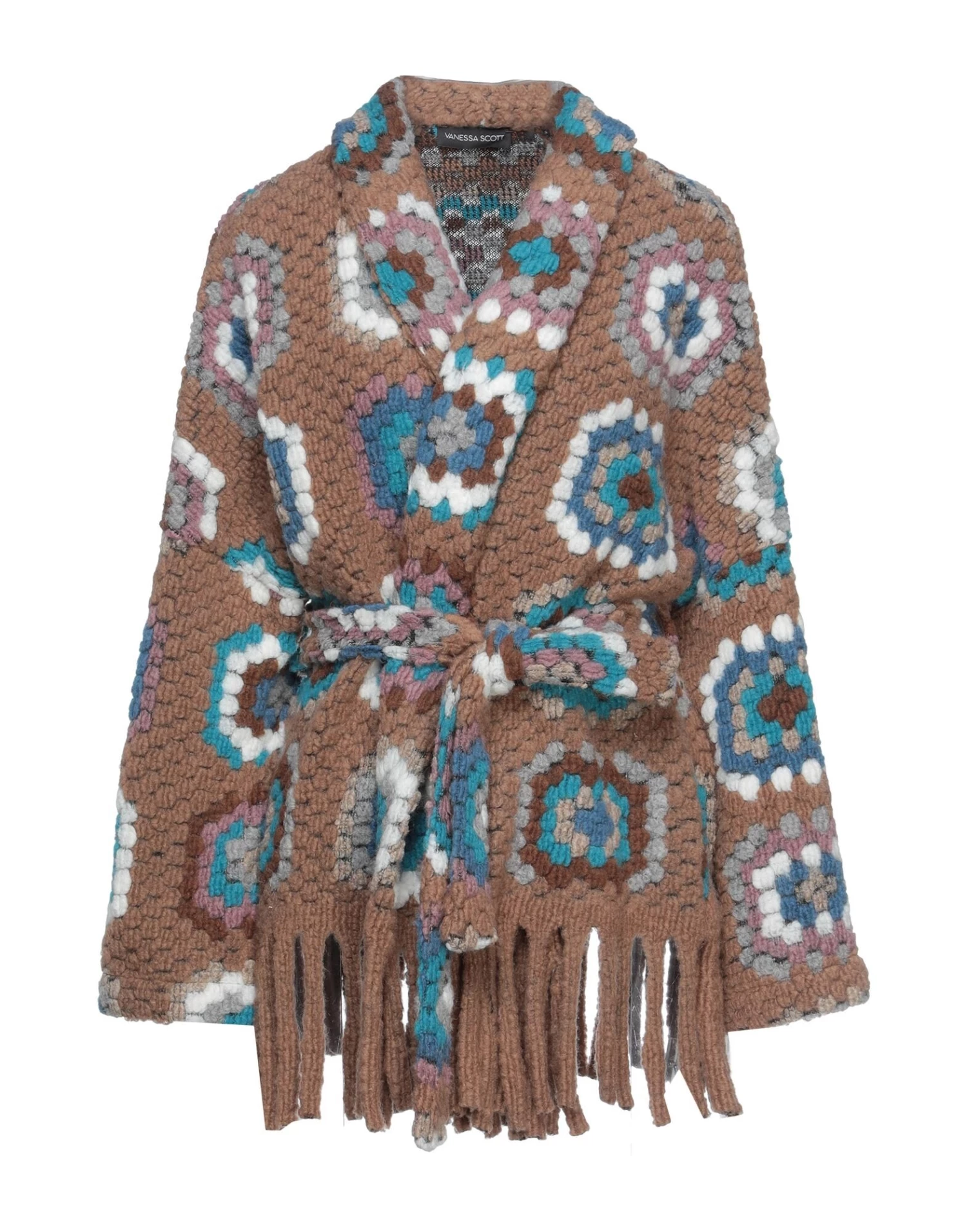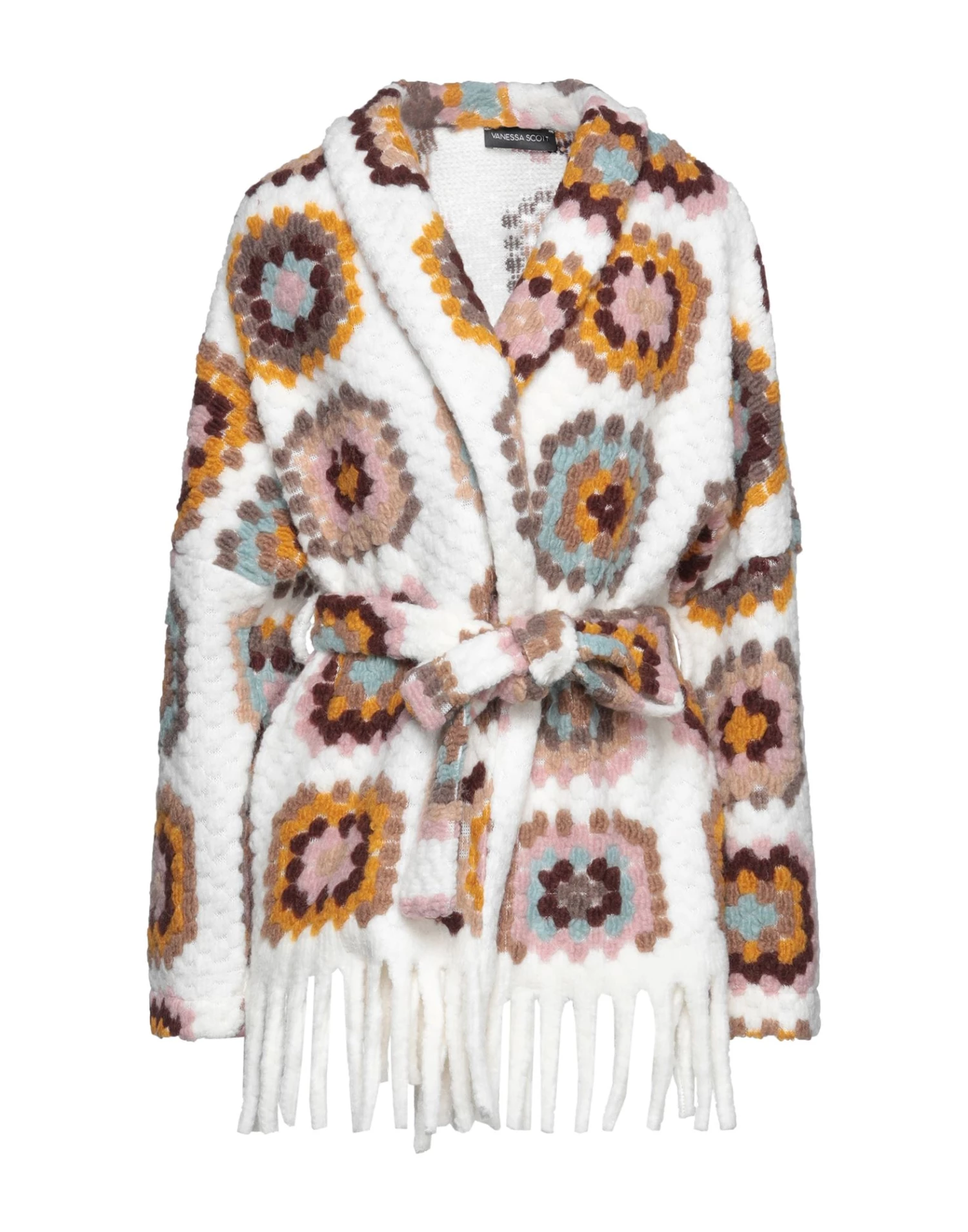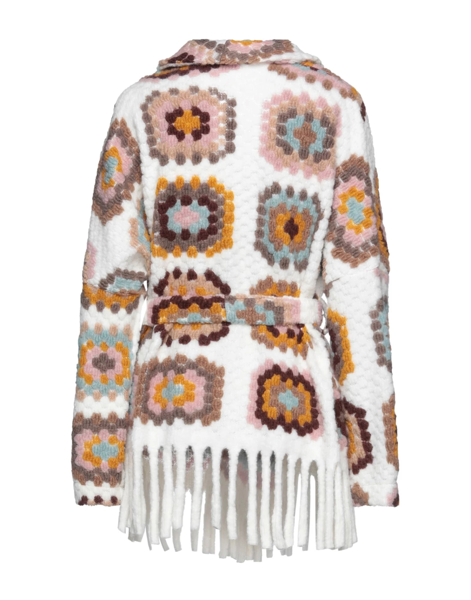 bouclé, belt, multicolor pattern, lapel collar, single-breasted , long sleeves, unlined, no pockets, fringed hem