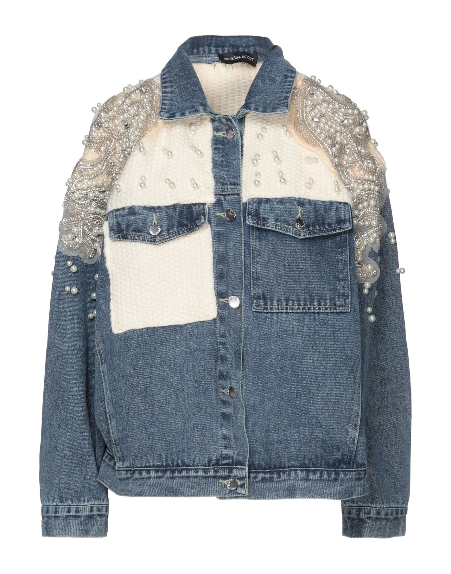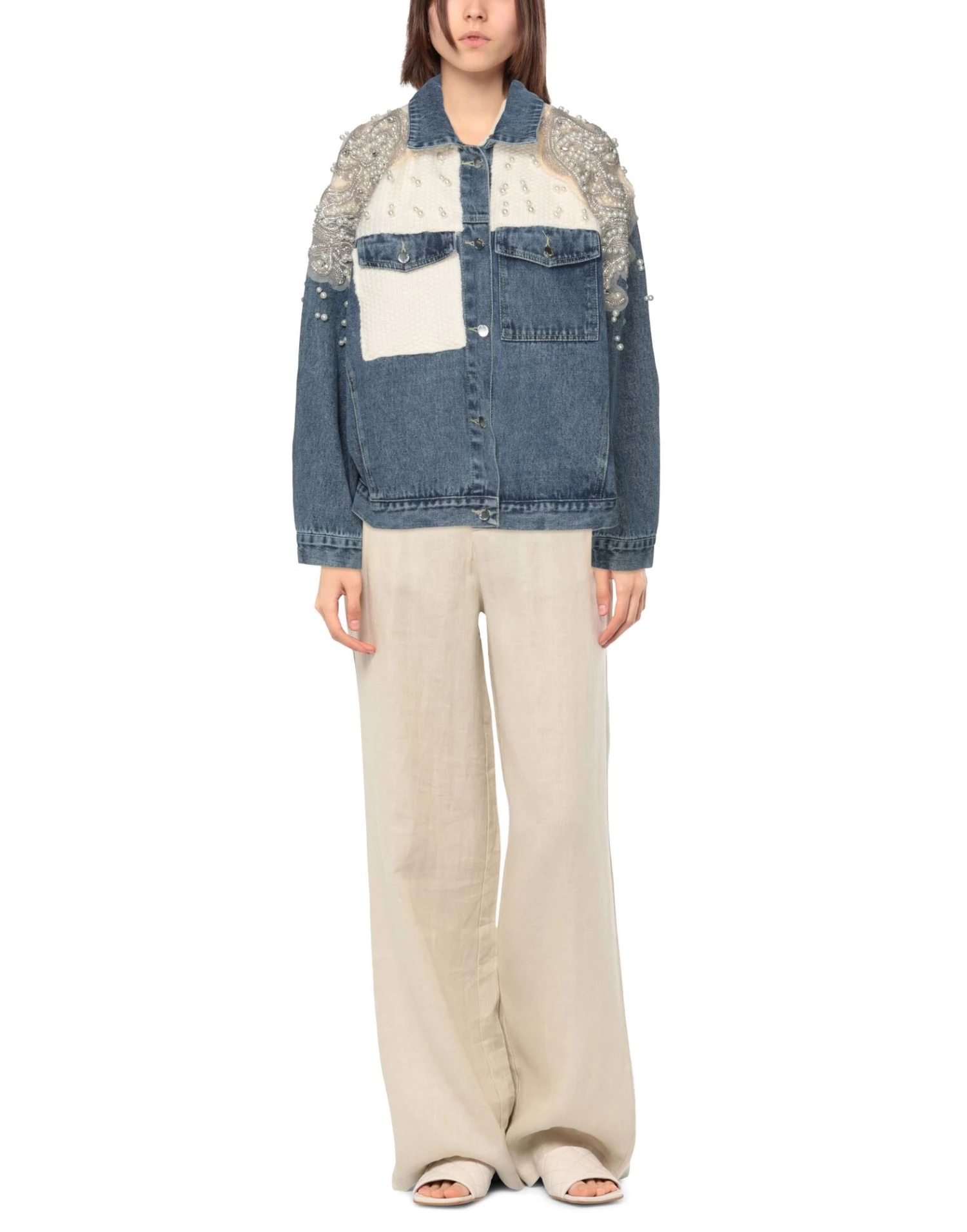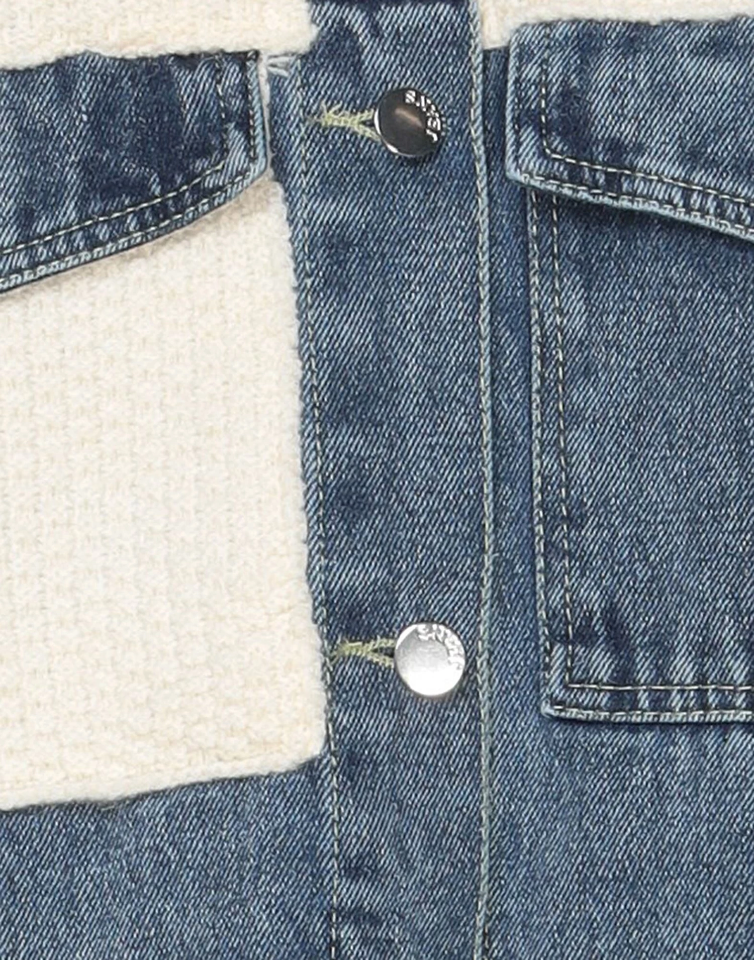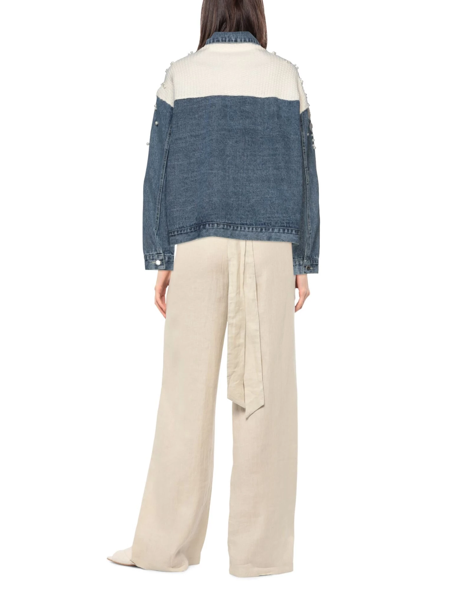 knitted, denim, rhinestones, beads, two-tone, dark wash, long sleeves, classic neckline, buttoned cuffs, unlined, multipockets, button closing, single-breasted , medium-weight knit