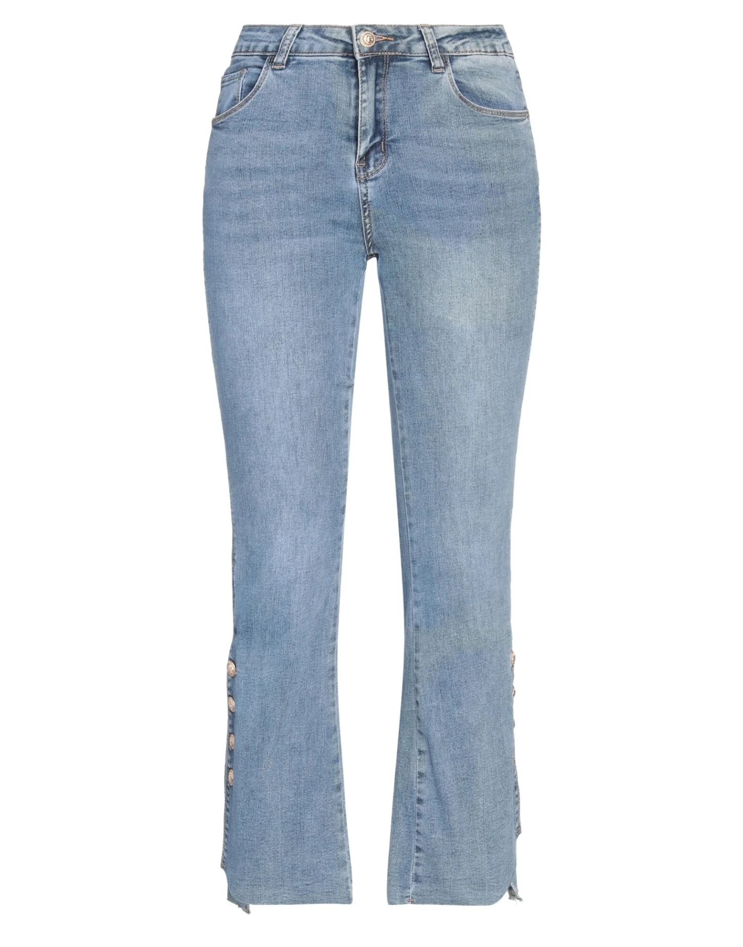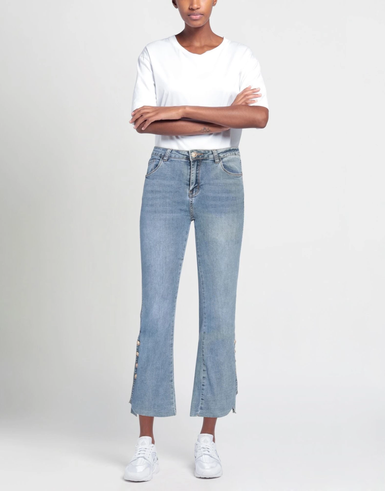 flared cut, denim, no appliqués, solid color, mid rise, belt loops, slim-leg pants, zipper closure, 1 button, five pockets, raw-cut hem, stretch, light wash, flare & wide-leg