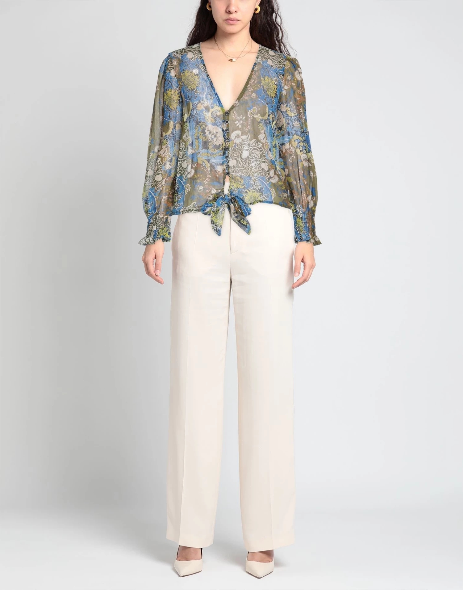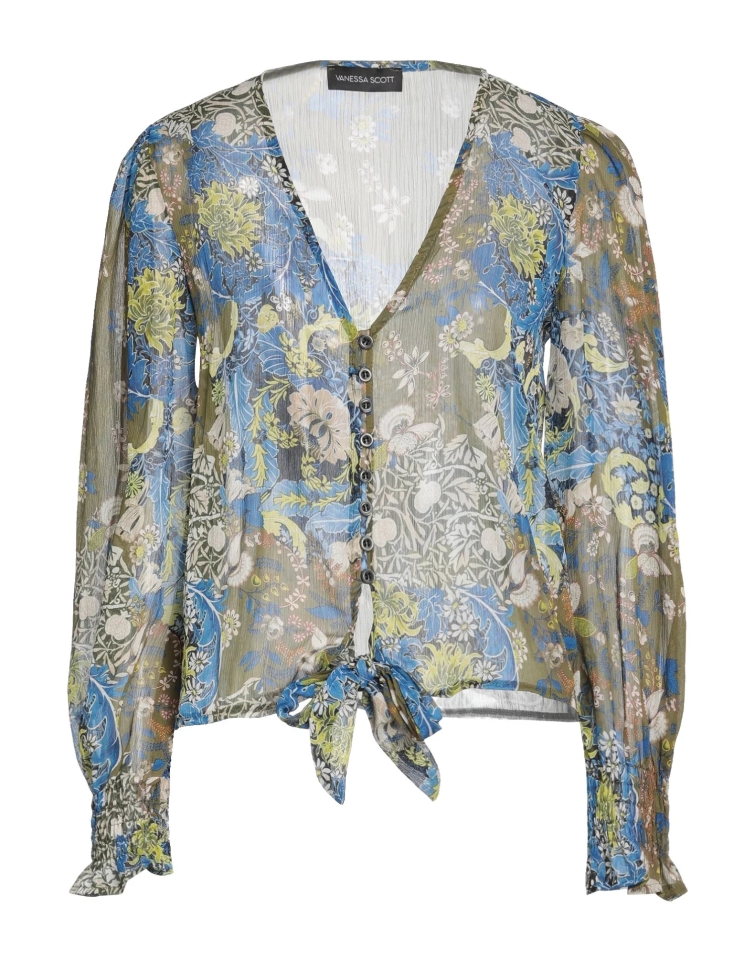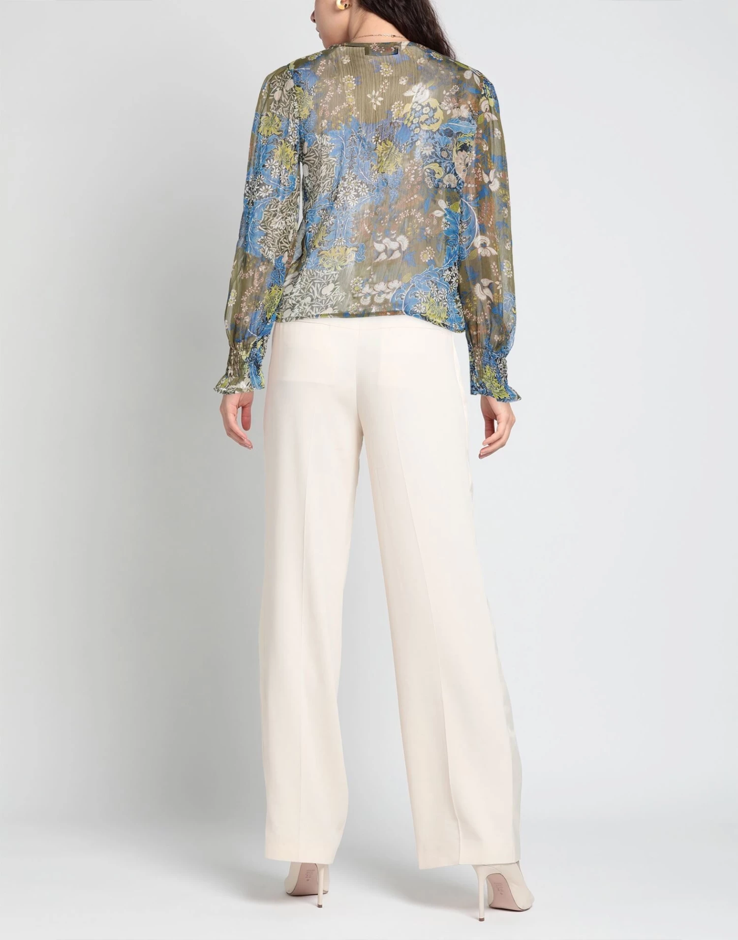 crepe, no appliqués, floral design, v-neck, long sleeves, button closing, no pockets