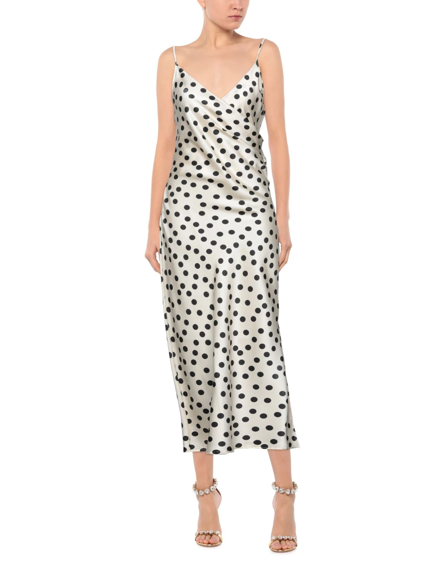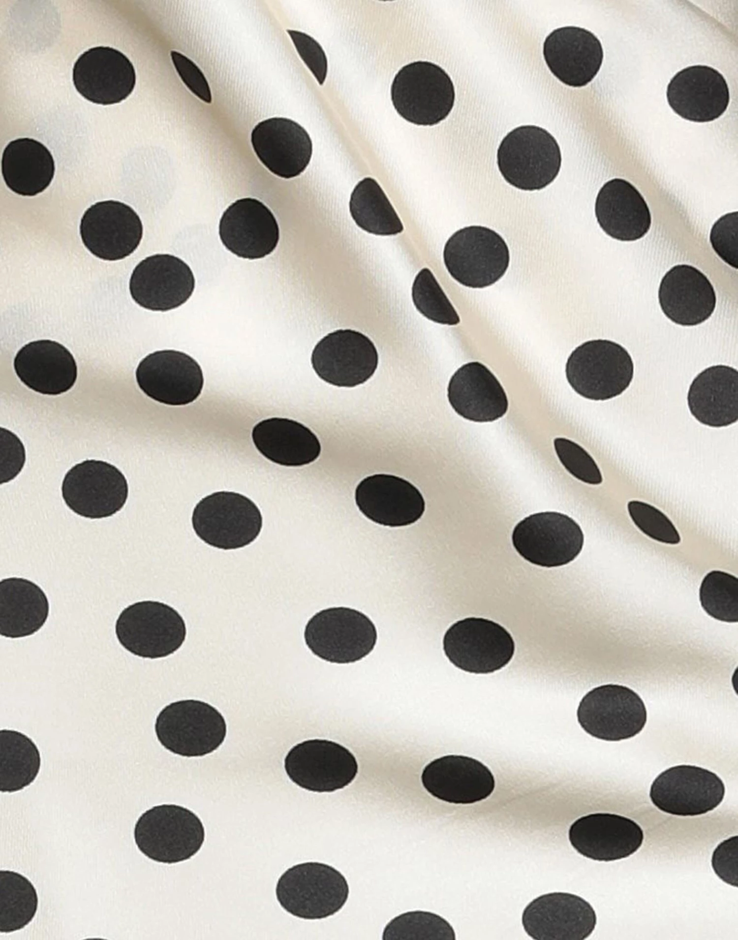 twill, no appliqués, polka-dot, deep neckline, sleeveless, unlined, zipper closure, no pockets, side slit