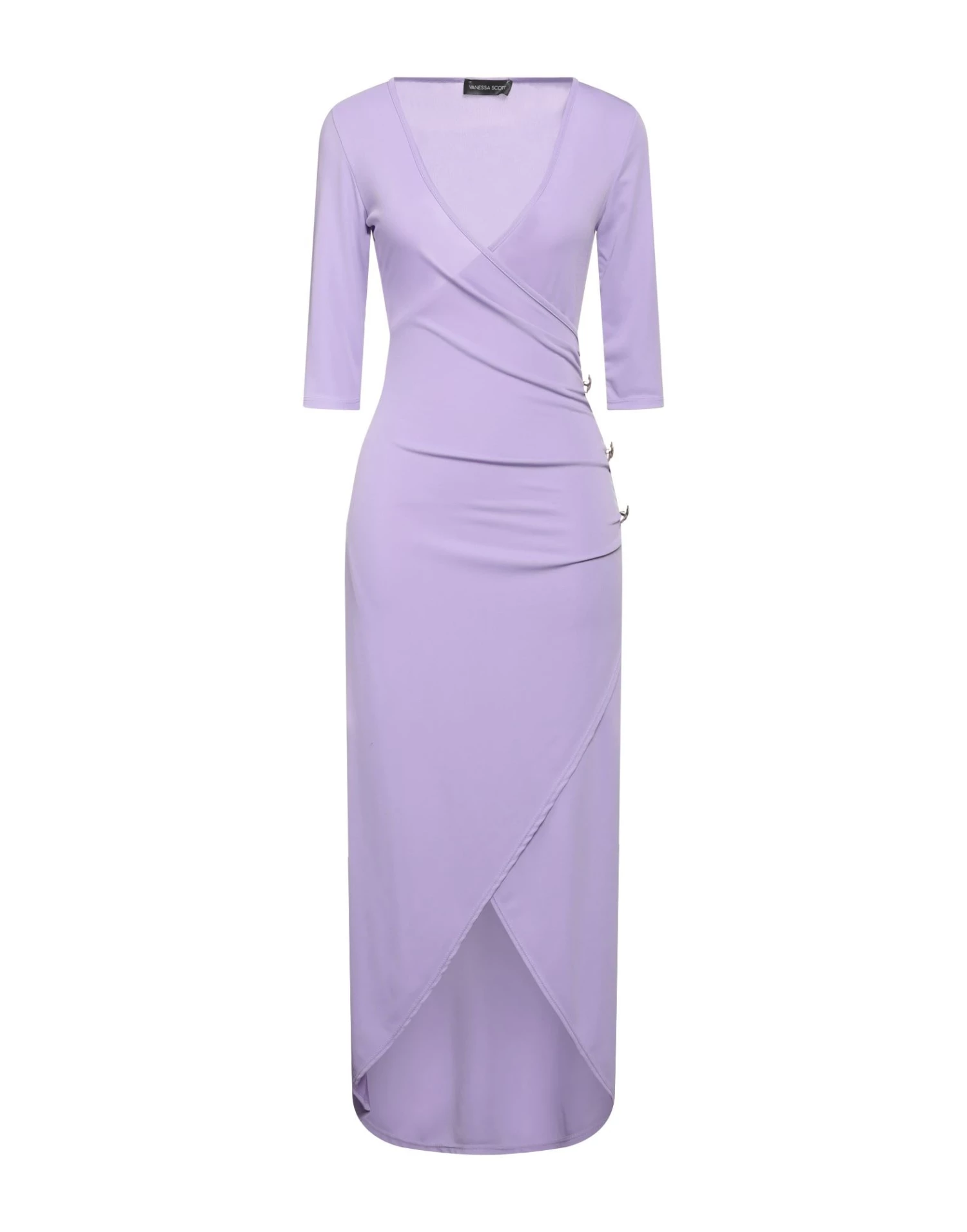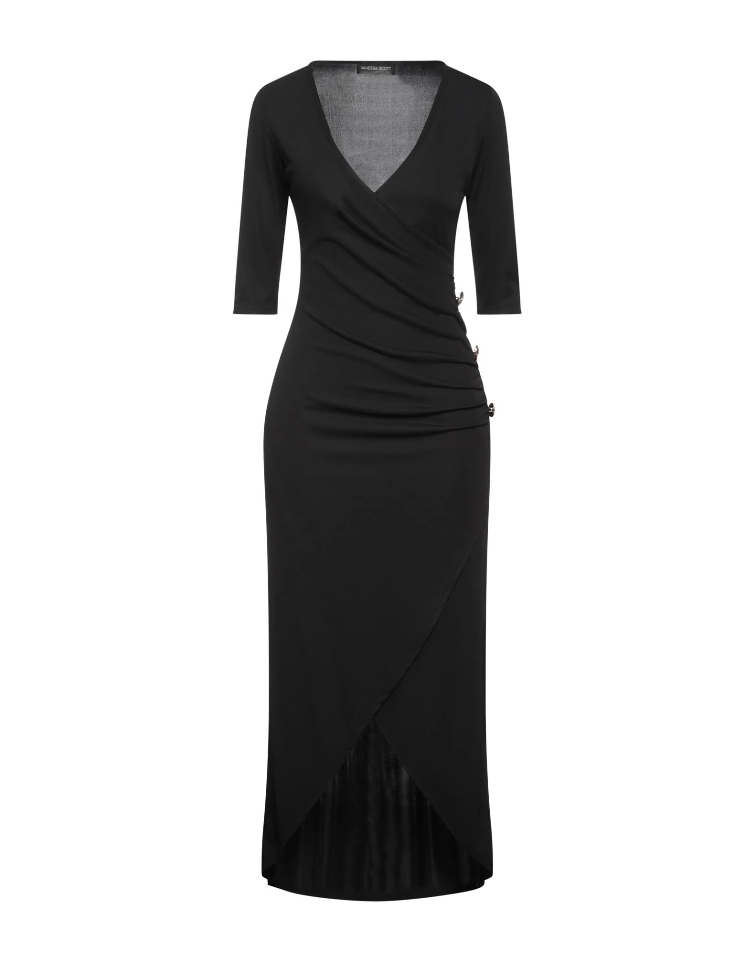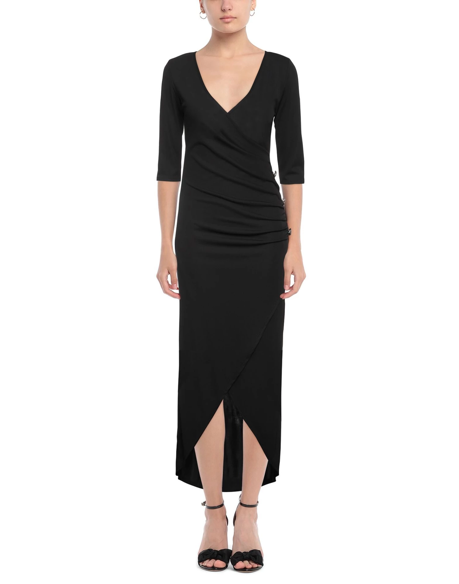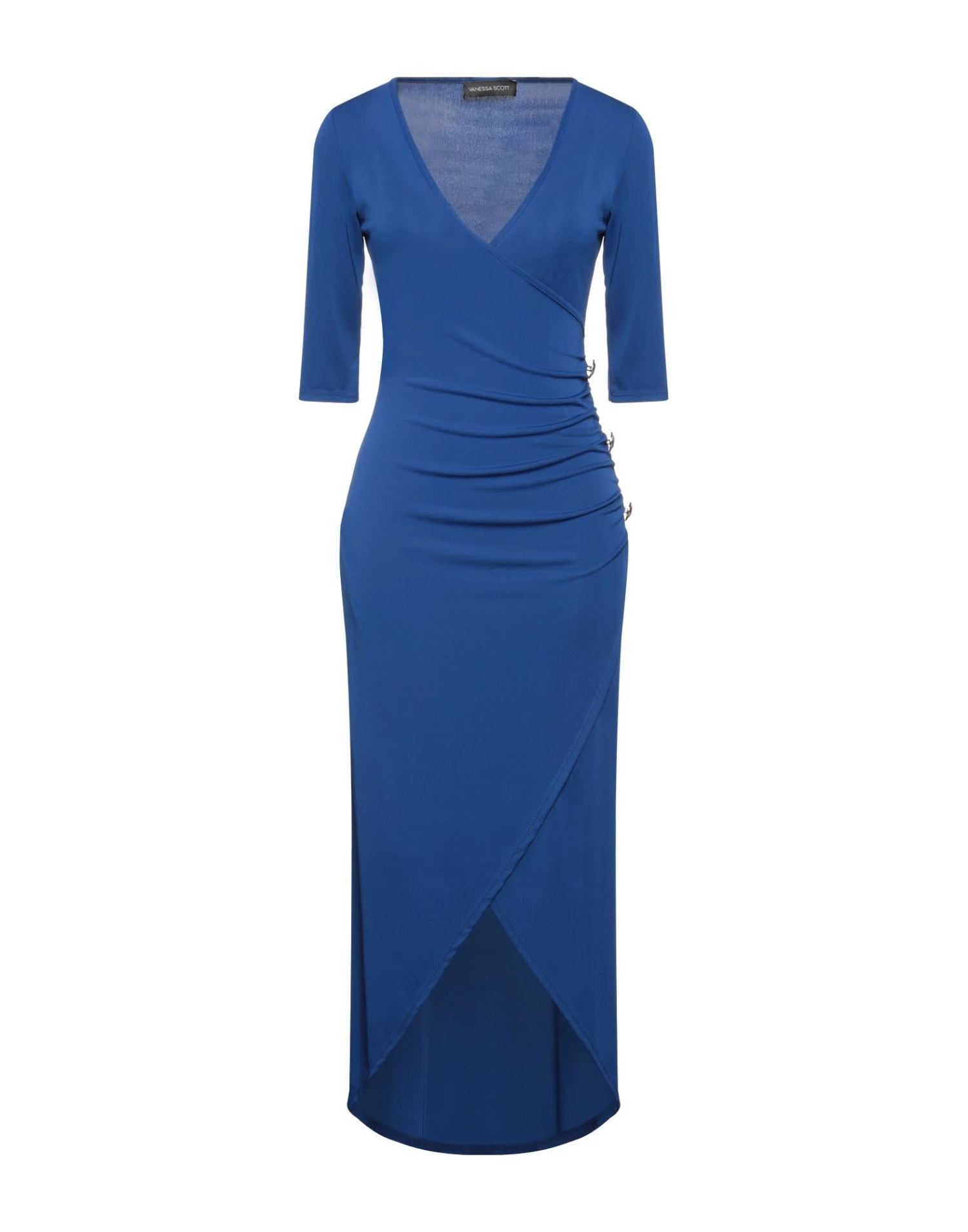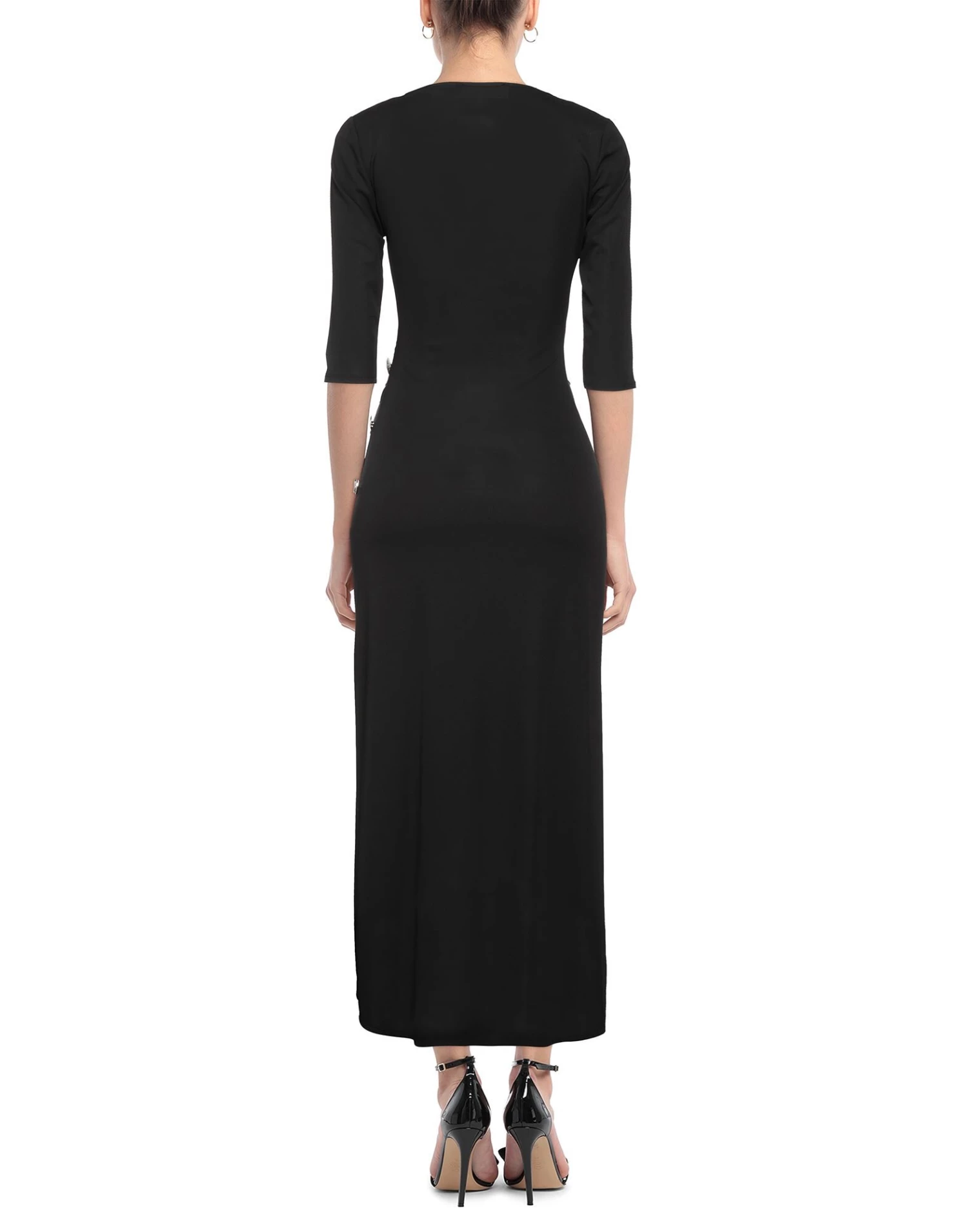 jersey, contrasting applications, solid colour with appliqués, deep neckline, 3/4 length sleeves, unlined, no pockets, side slit, stretch, pencil style