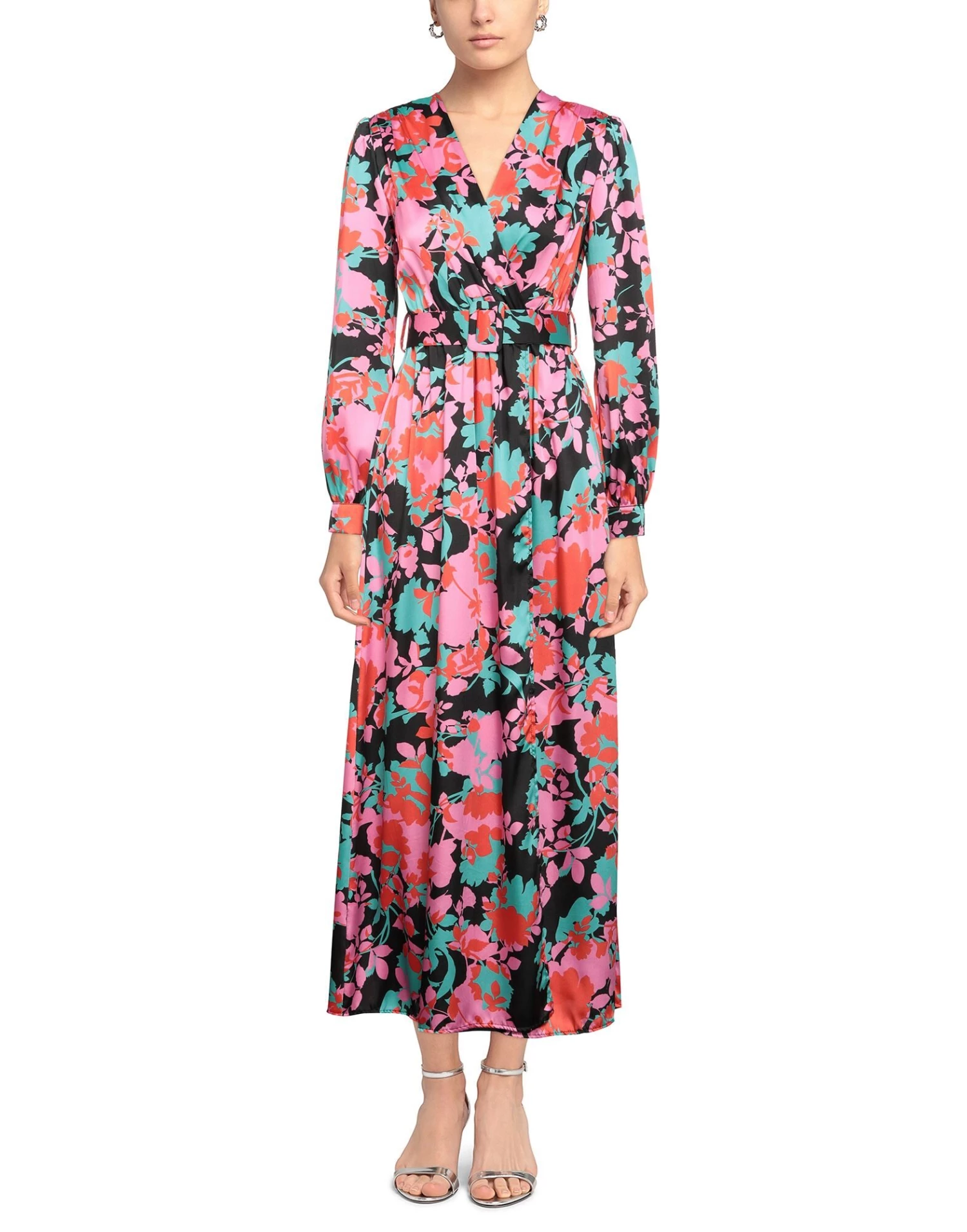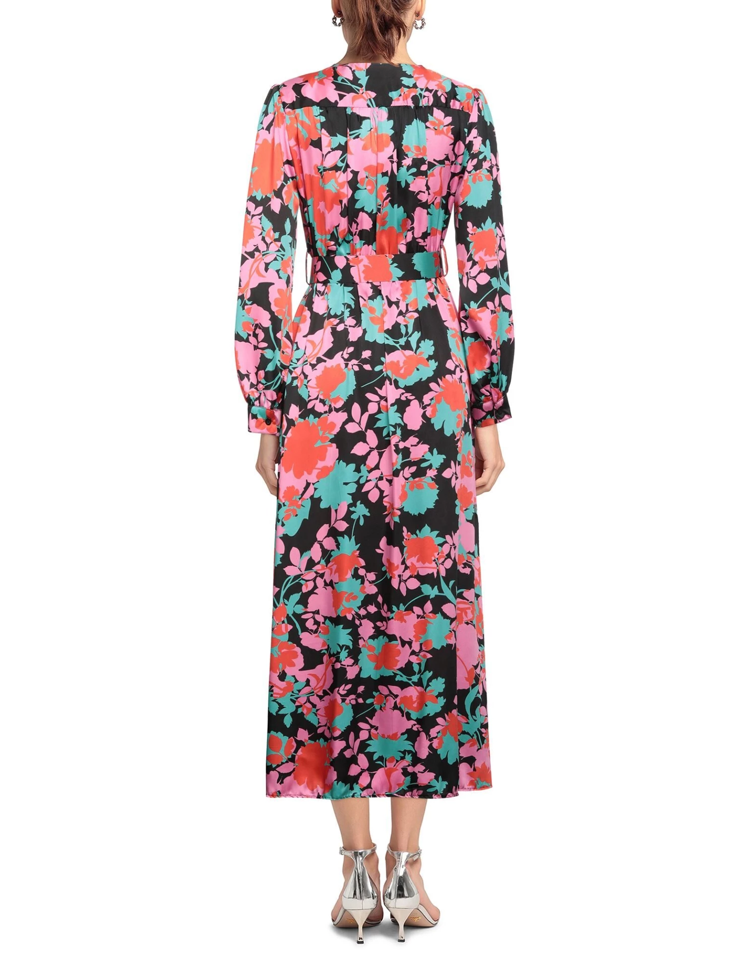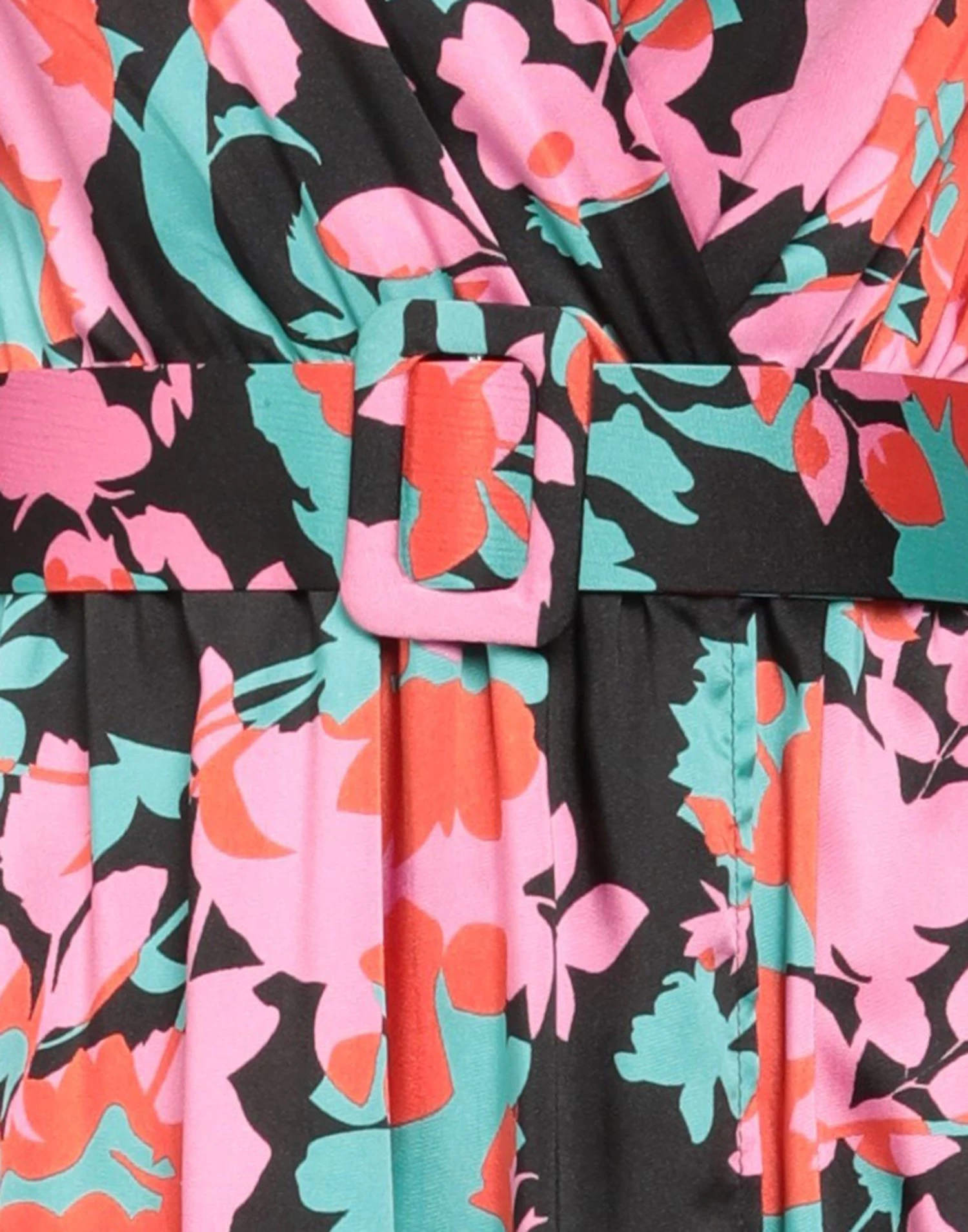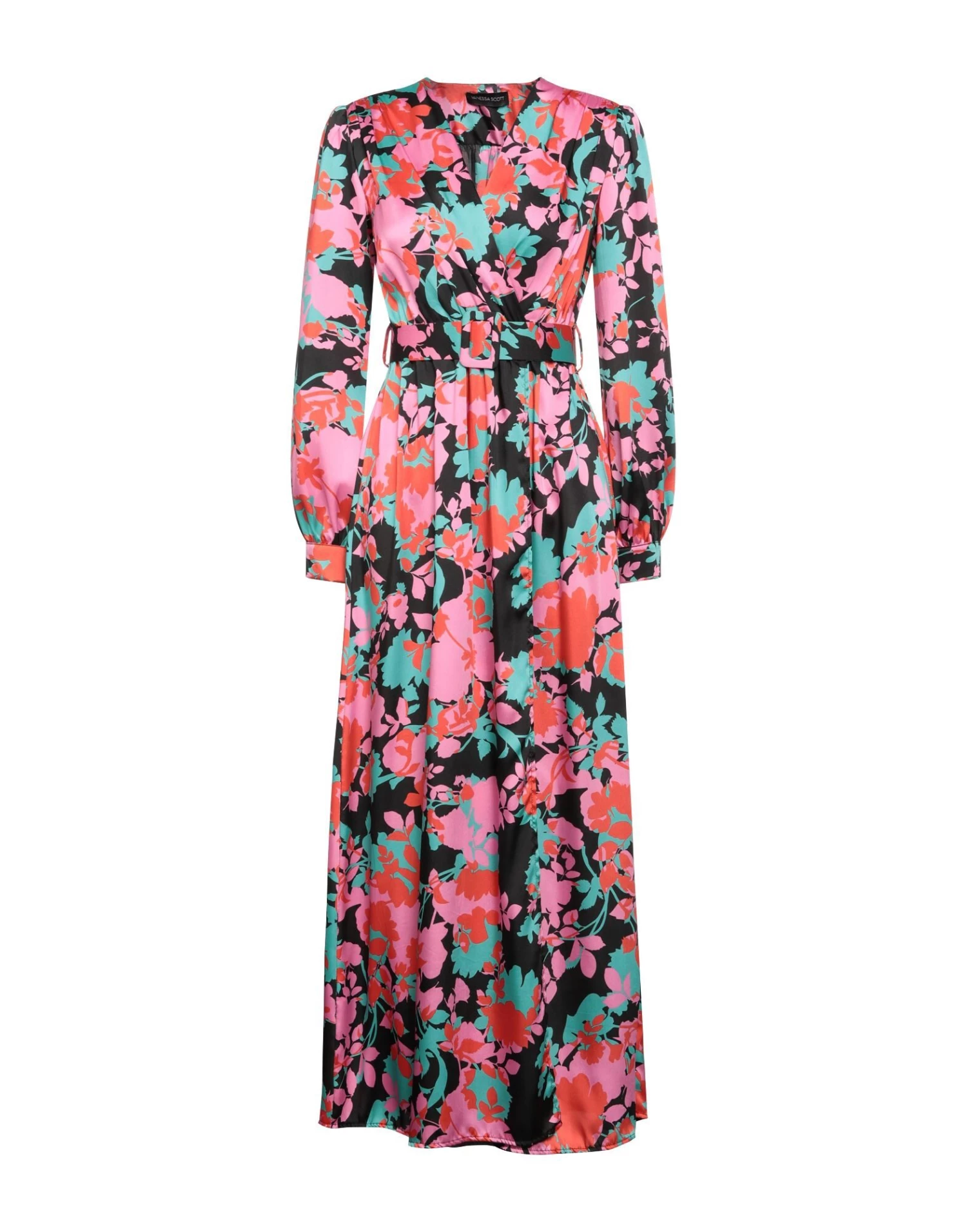 satin, belt, floral design, deep neckline, long sleeves, with shoulder pad, unlined, no pockets, front slit, empire style