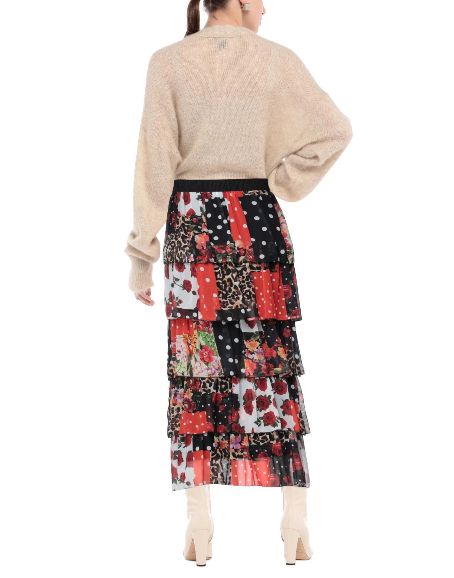 crepe, ruffles, floral design, elasticized waist, no pockets, fully lined