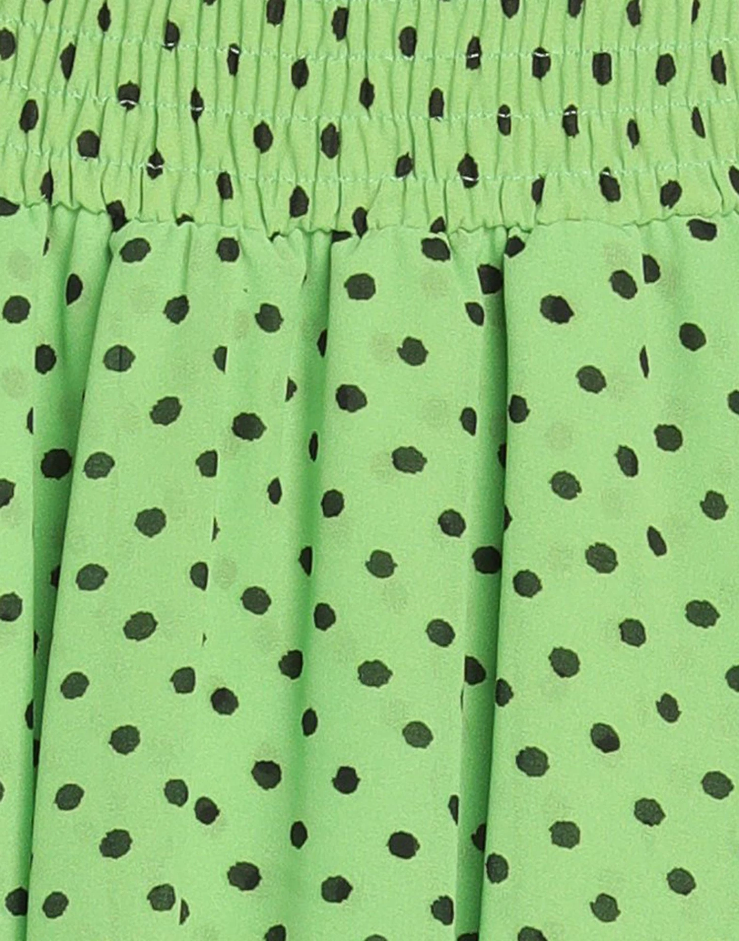 crepe, ruffles, polka-dot, elasticized waist, fully lined, no pockets
