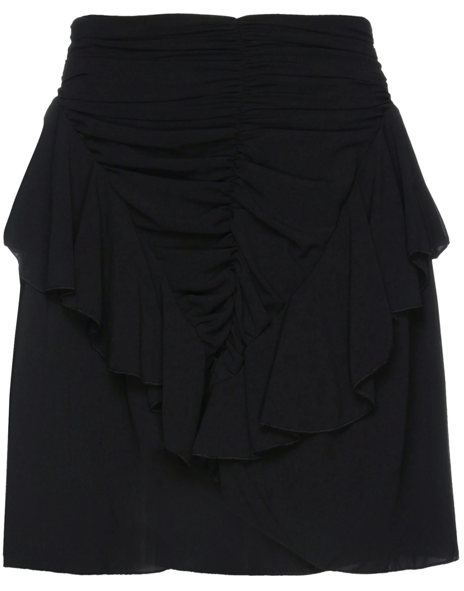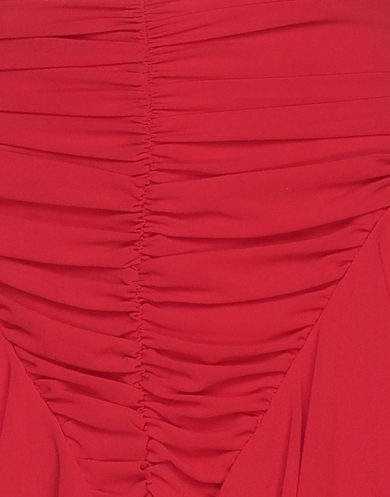 crepe, ruffles, draped detailing, solid color, mid rise, regular fit, fully lined, zipper closure, no pockets