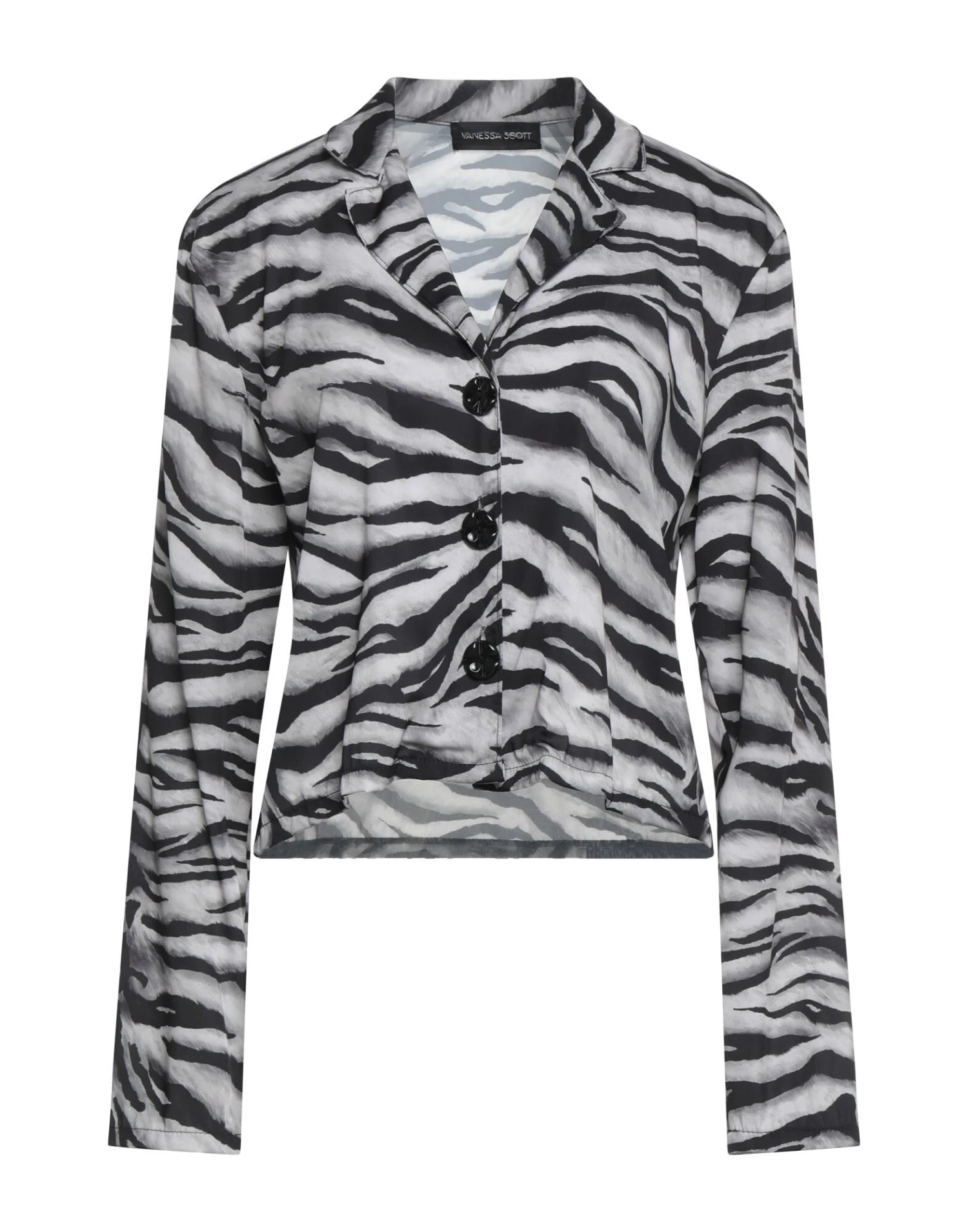 satin, no appliqués, zebra stripes, lapel collar, long sleeves, button closing, no pockets