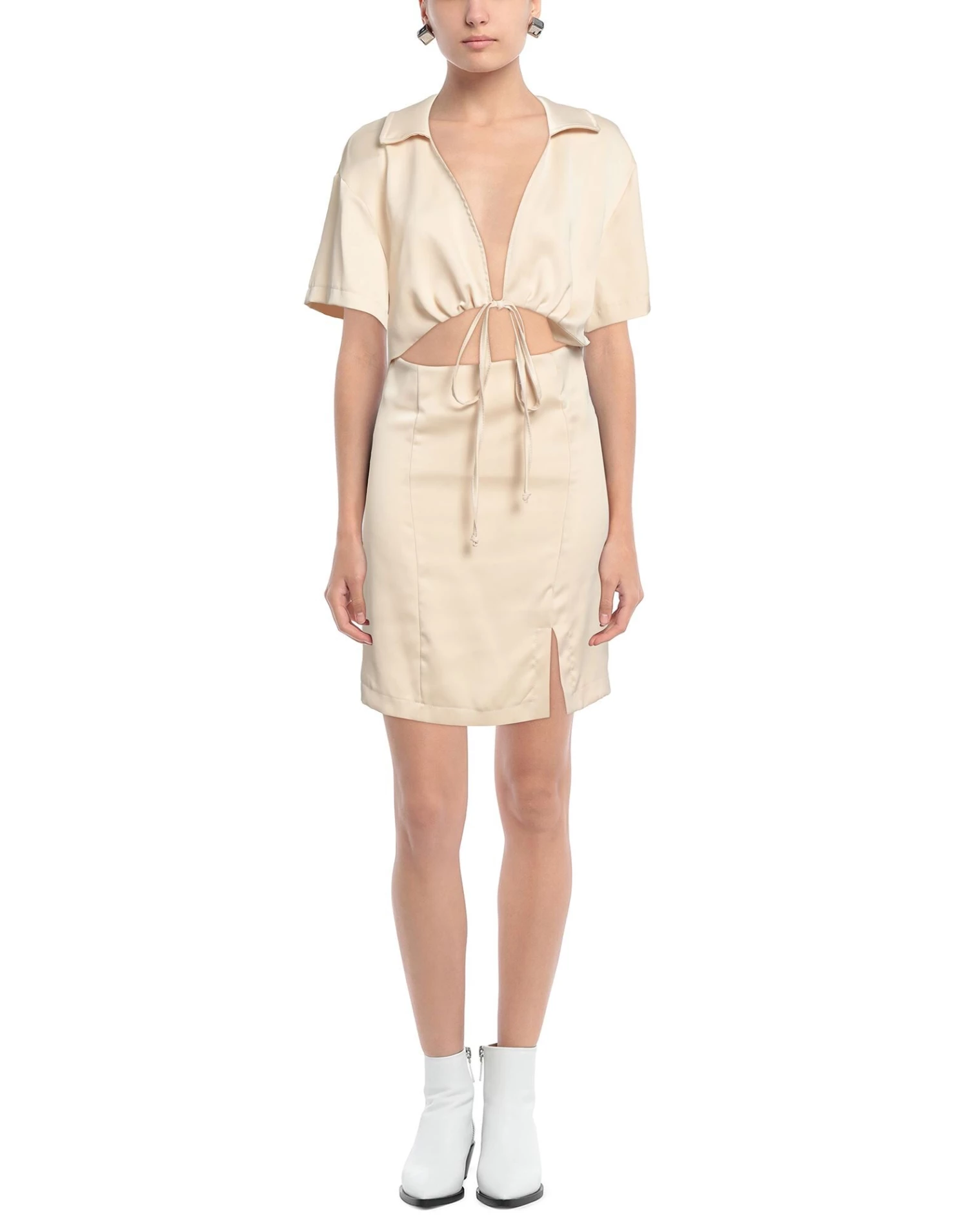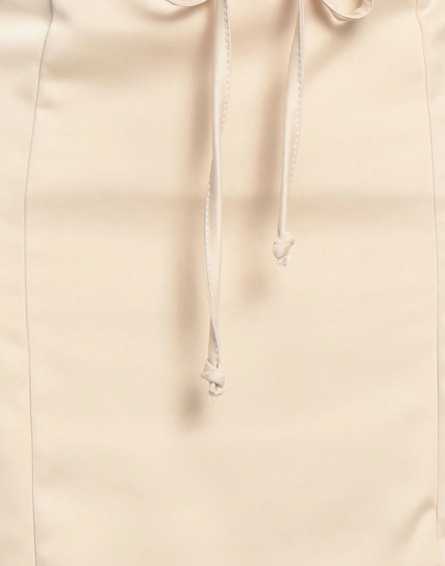 satin, no appliqués, solid color, classic neckline, short sleeves, unlined, self-tie closure, zipper closure, no pockets, stretch, pencil style