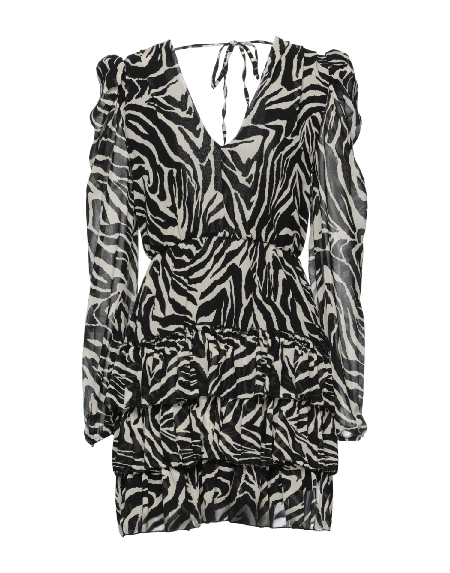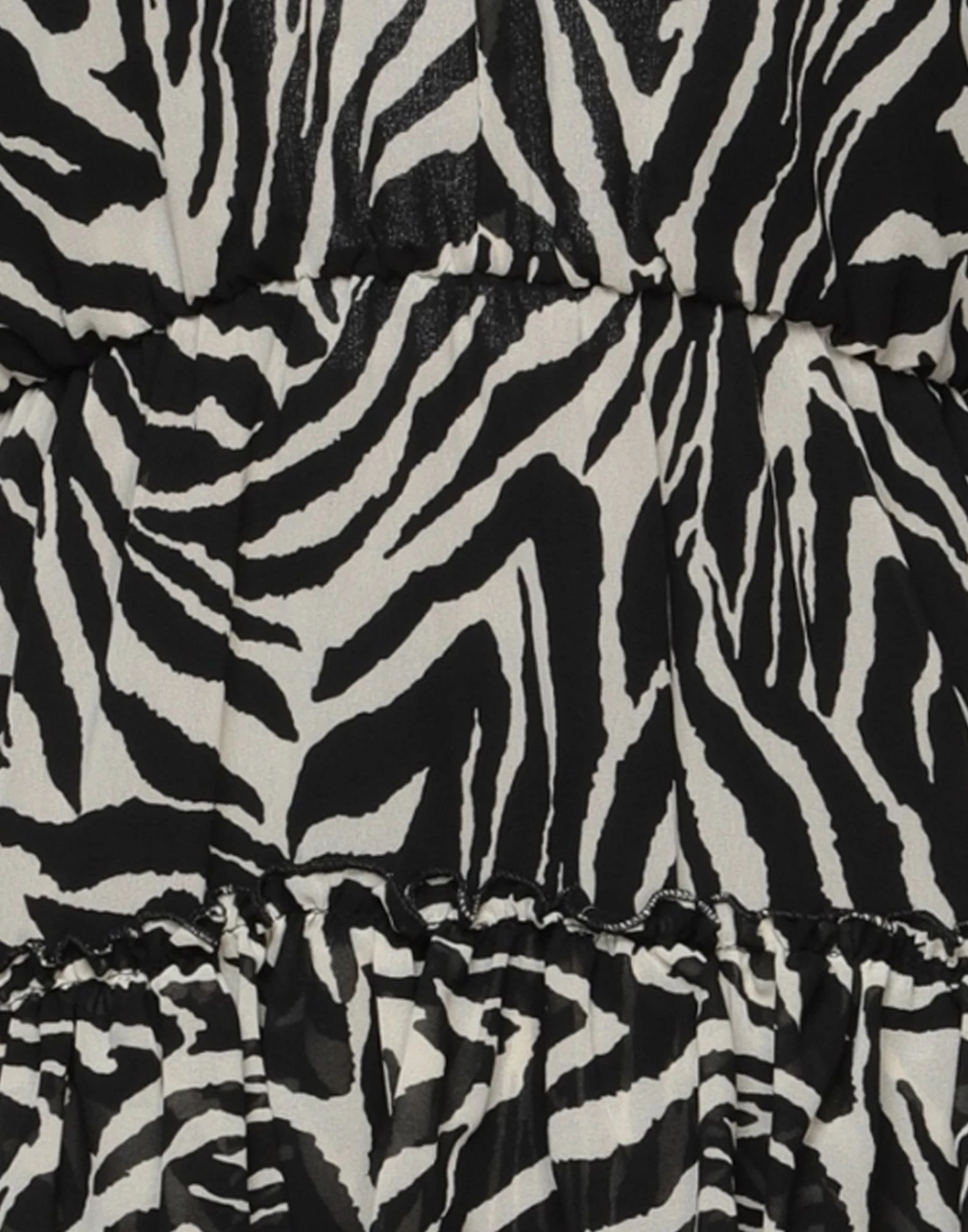 crepe, ruffles, zebra stripes, deep neckline, long sleeves, cuffs with elastic, fully lined, self-tie closure