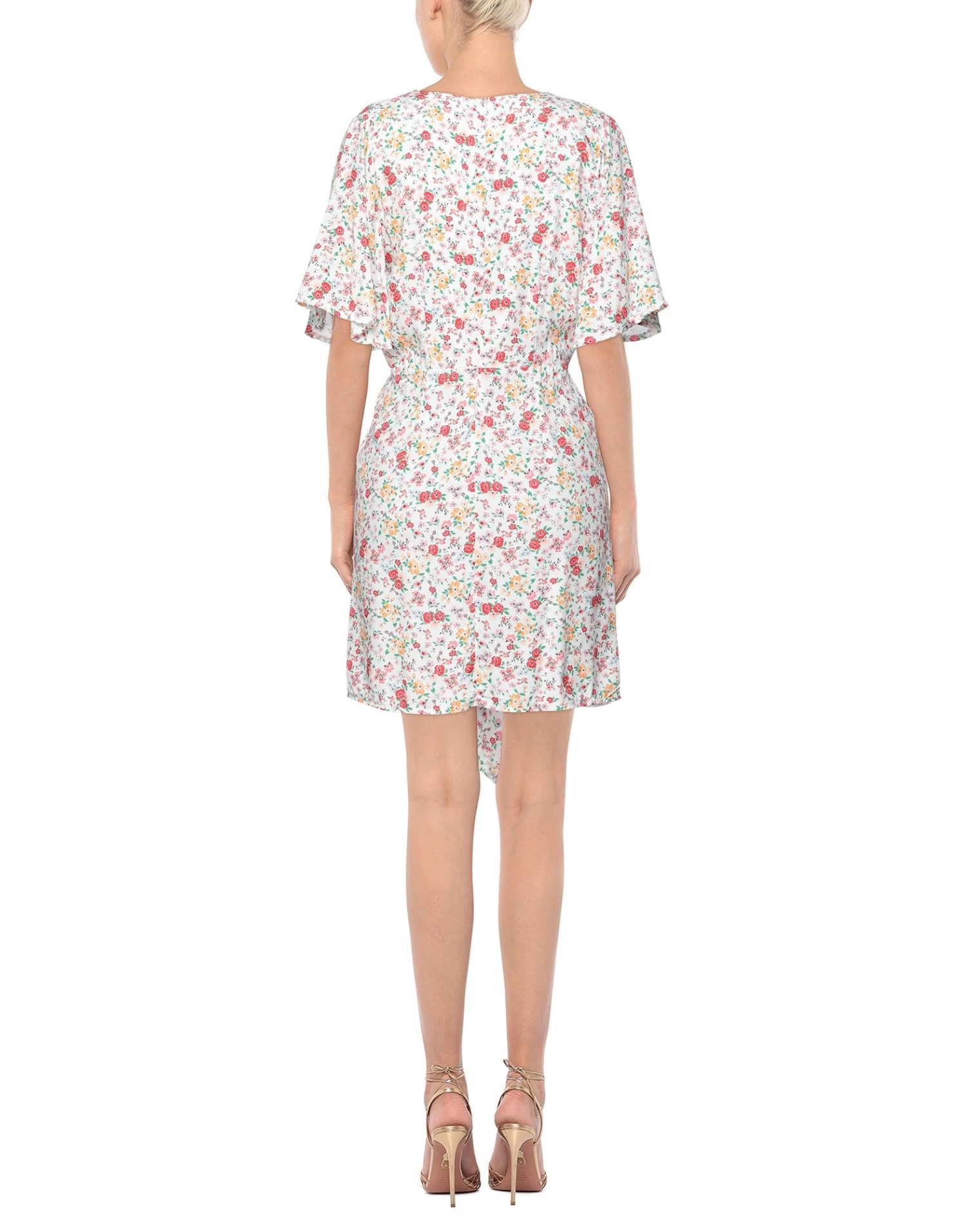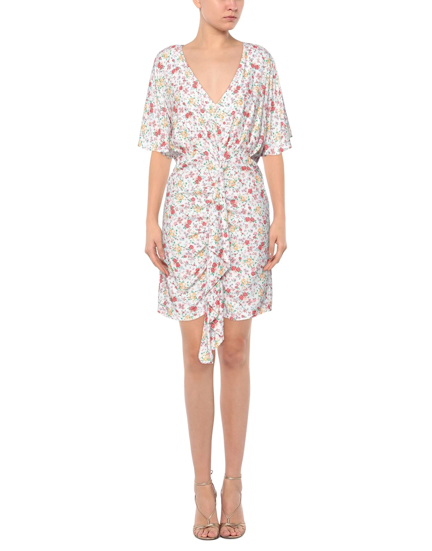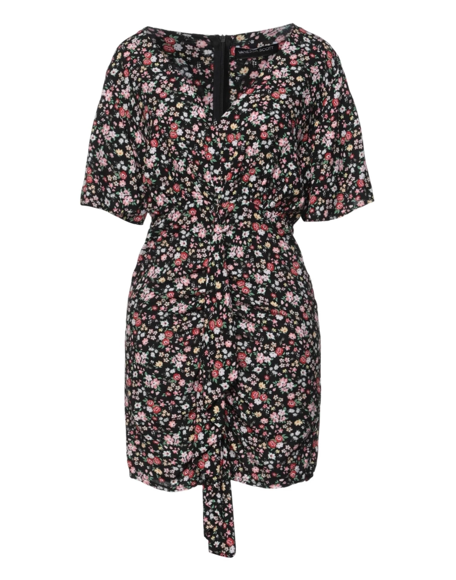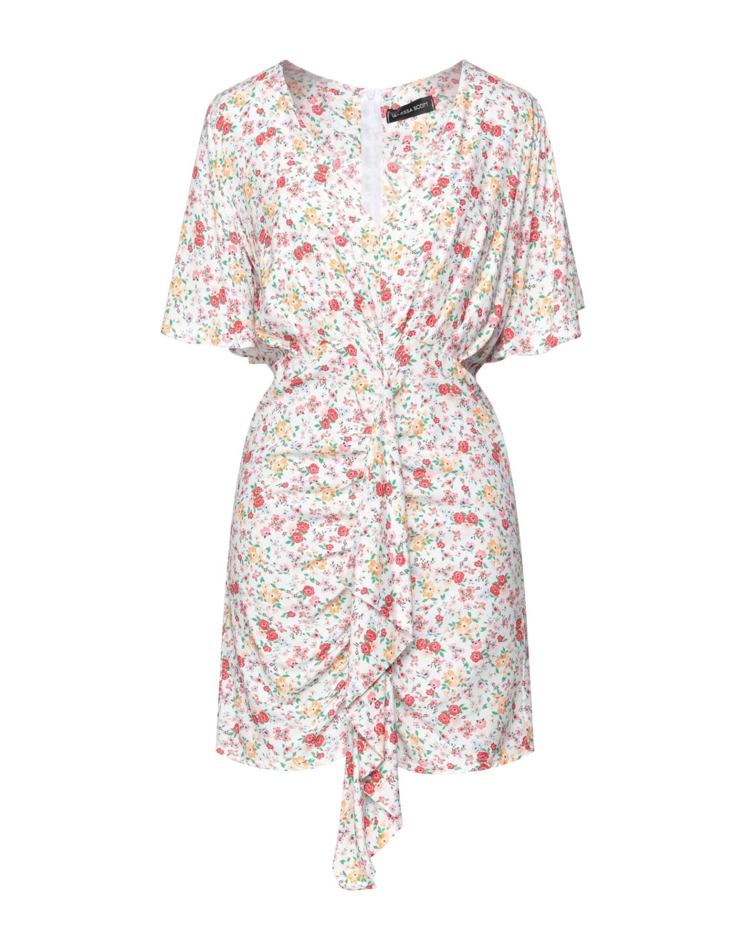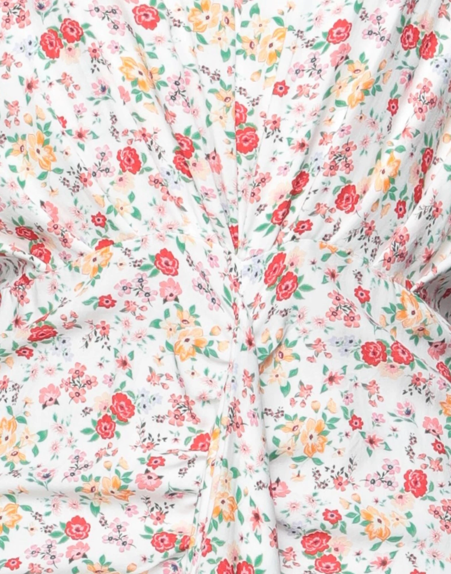 plain weave, folds, ruffles, floral design, v-neck, short sleeves, no pockets, zipper closure, partially lined interior