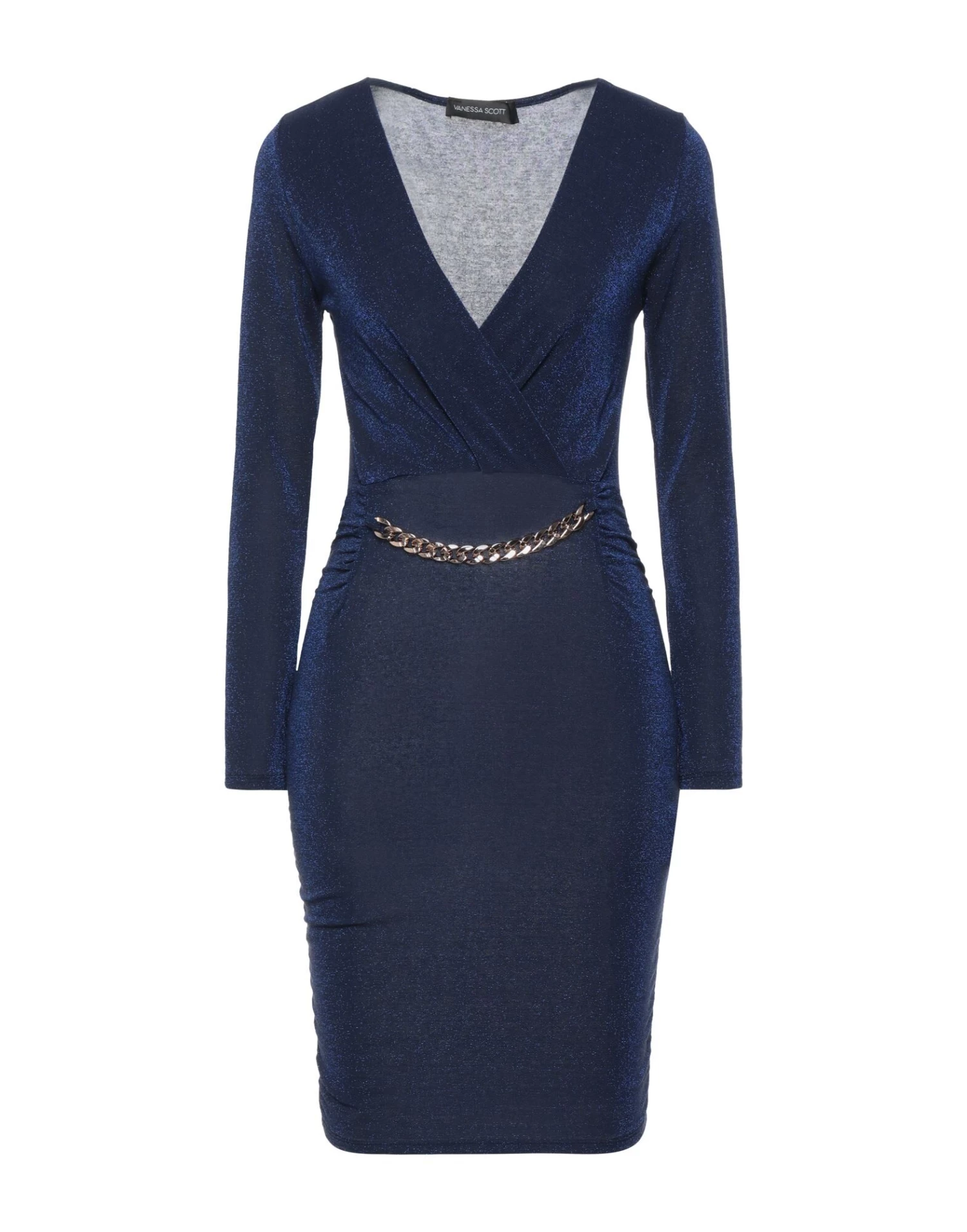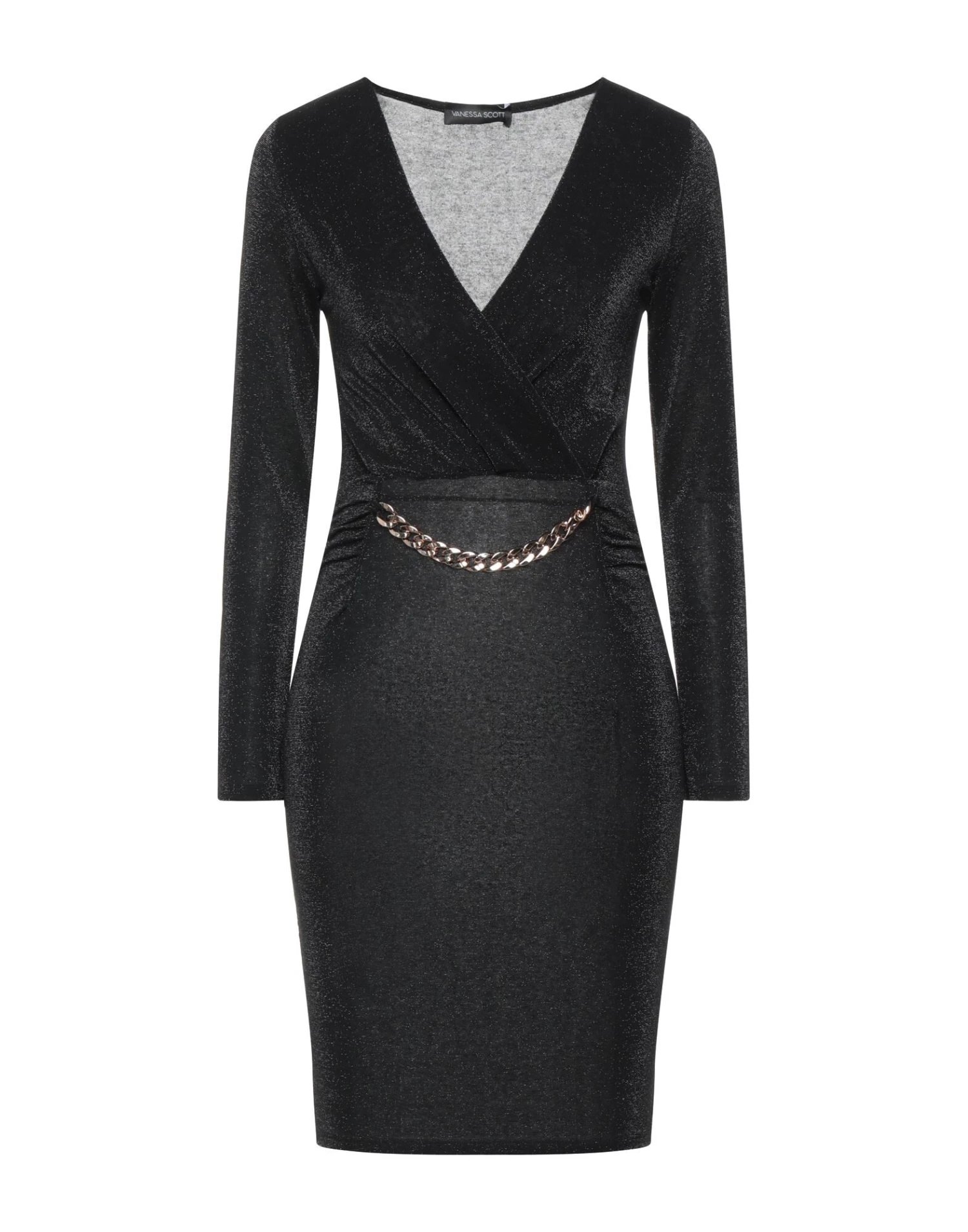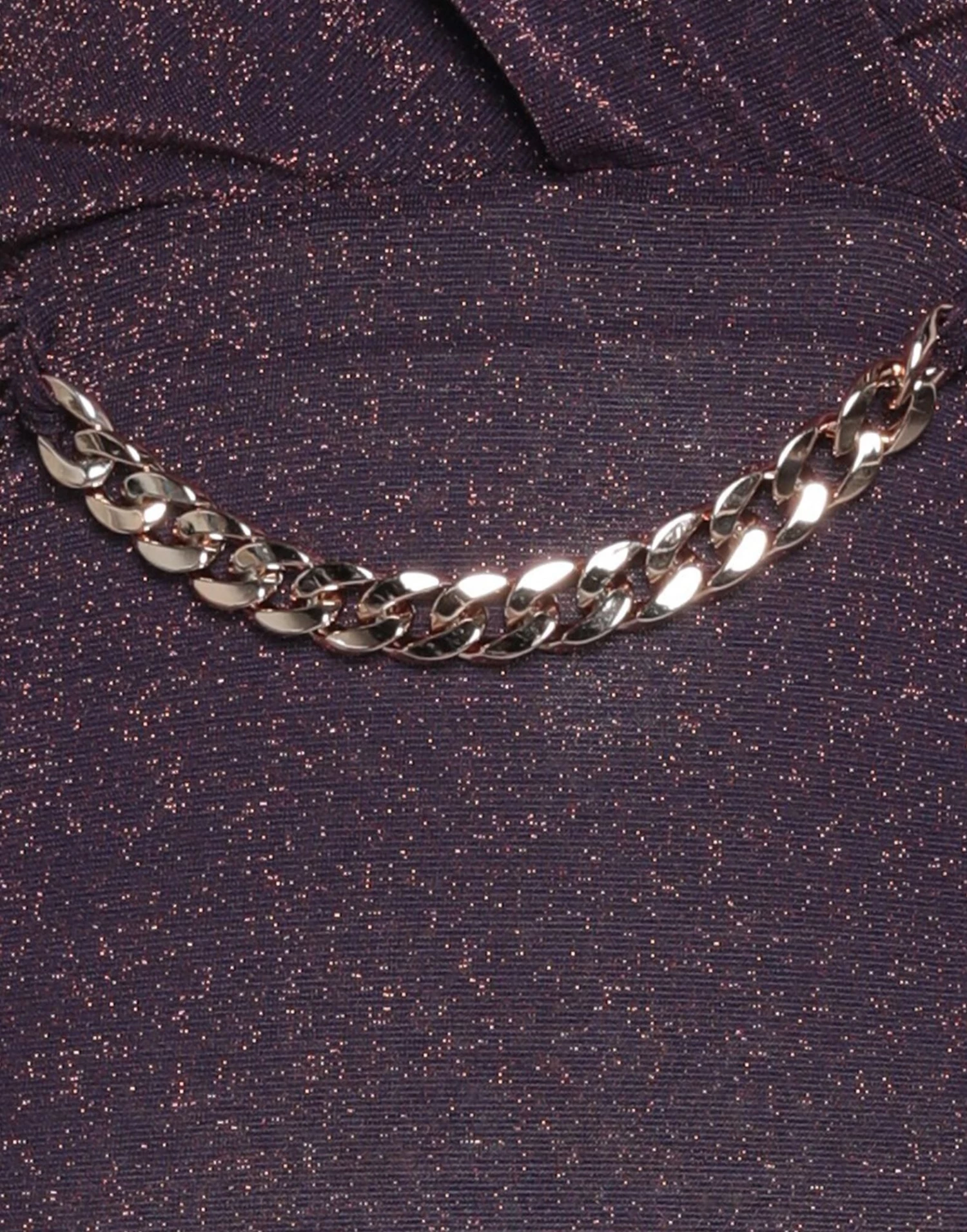 knitted, lamé, draped detailing, metal applications, solid colour with appliqués, deep neckline, long sleeves, unlined, no pockets, lightweight knit, stretch