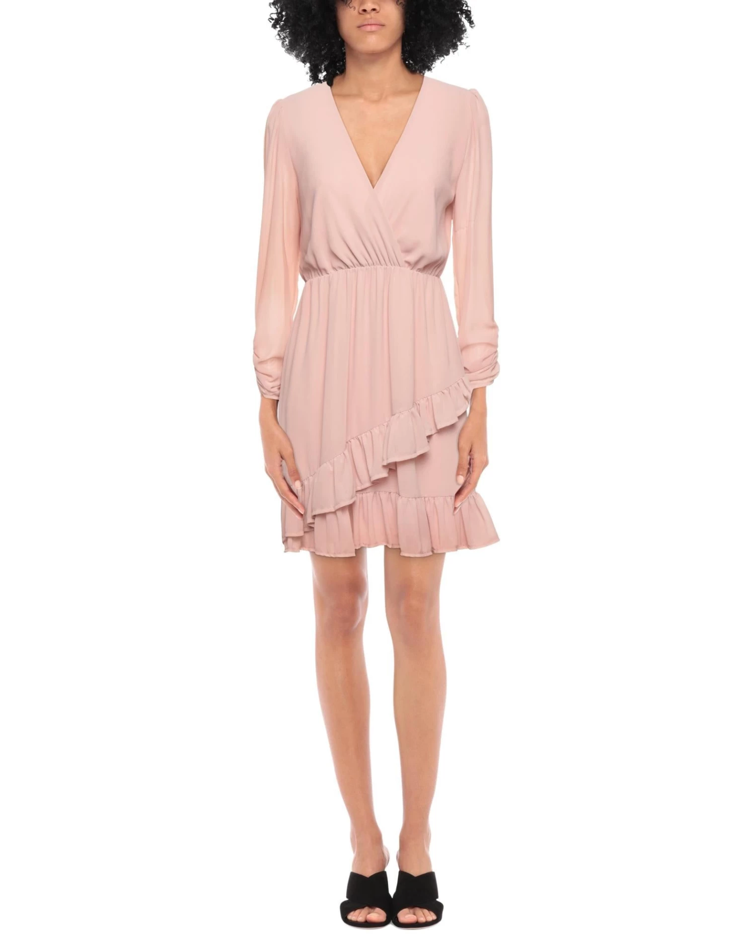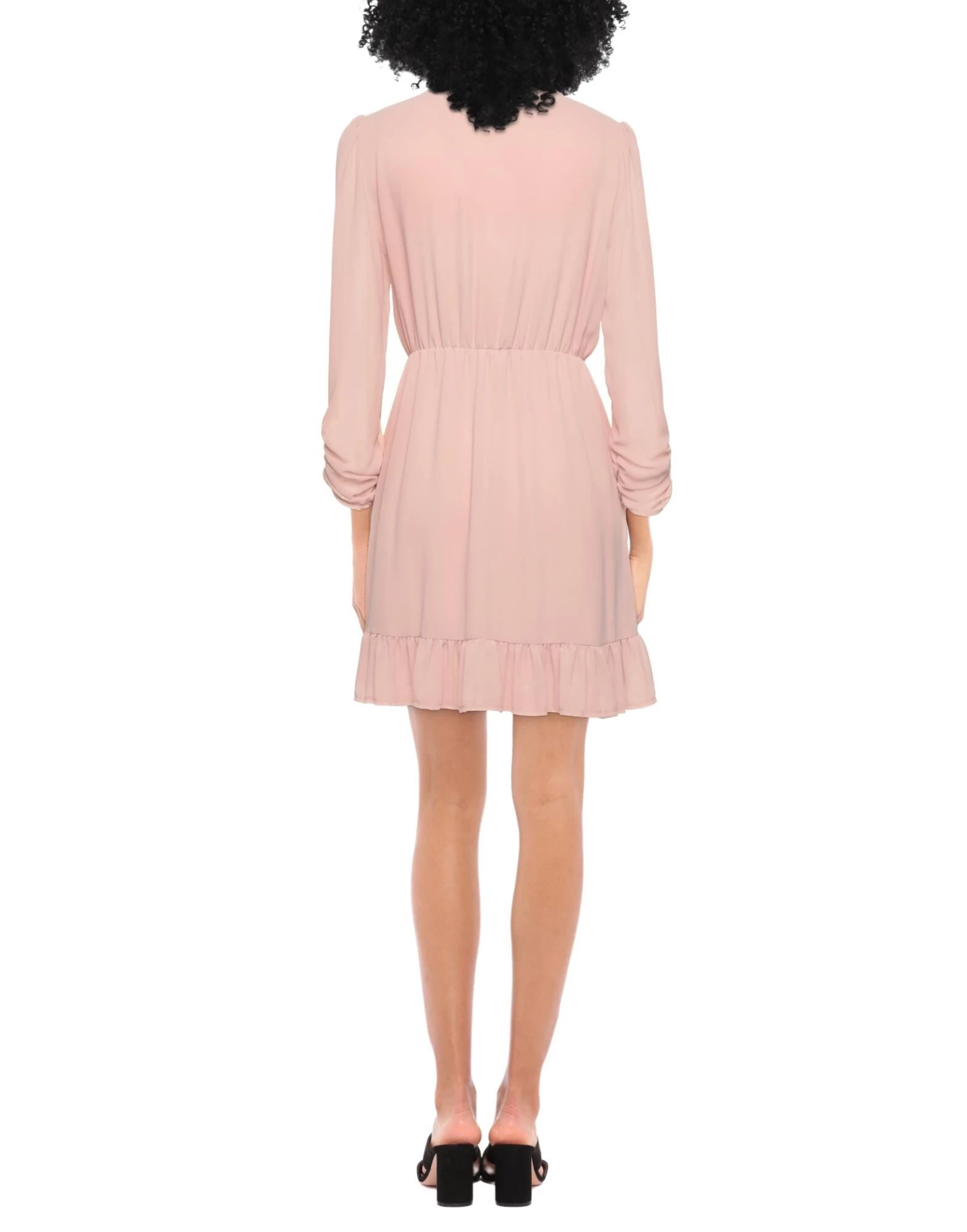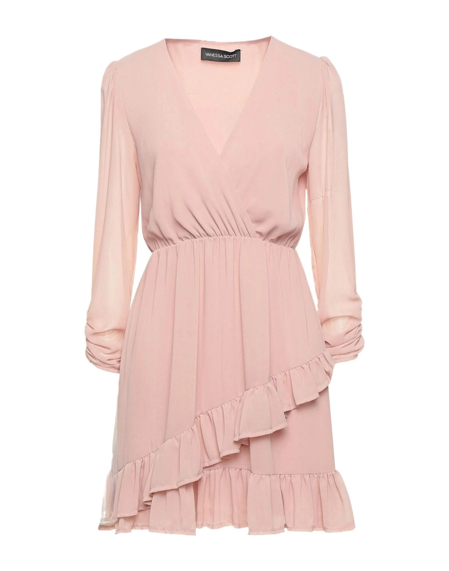 crepe, ruffles, ruffles, solid colour with appliqués, deep neckline, long sleeves, no pockets, unlined