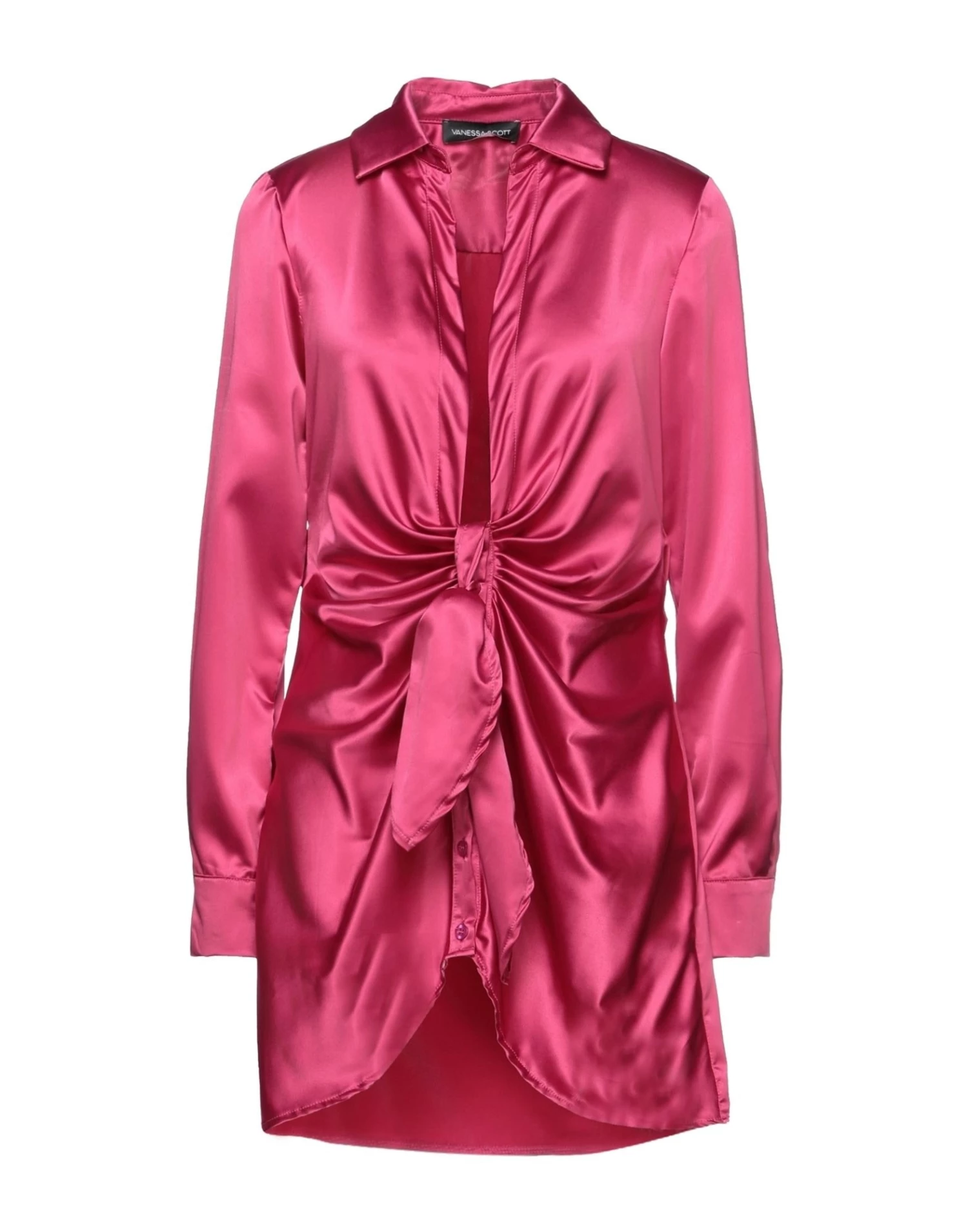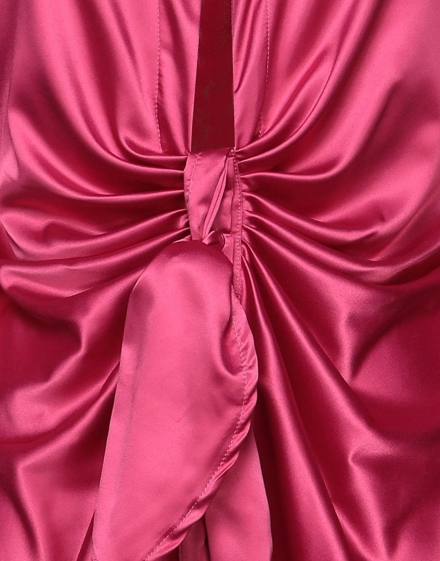 satin, folds, solid color, deep neckline, long sleeves, buttoned cuffs, unlined, button closing