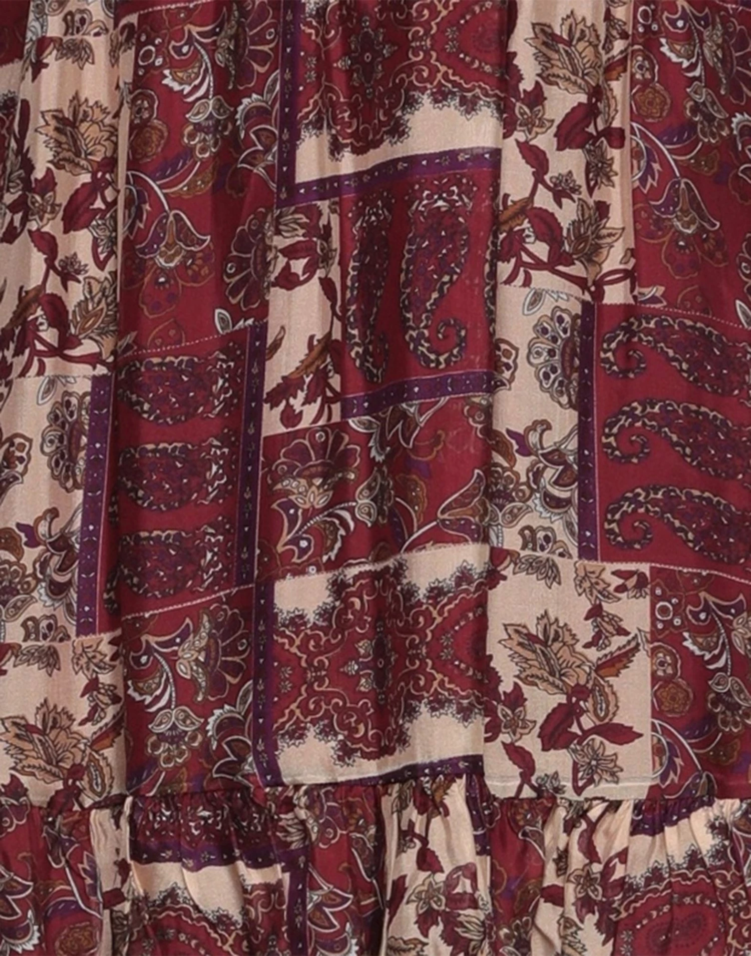 satin, no appliqués, bow collar, long sleeves, paisley-print, partially lined interior, no pockets