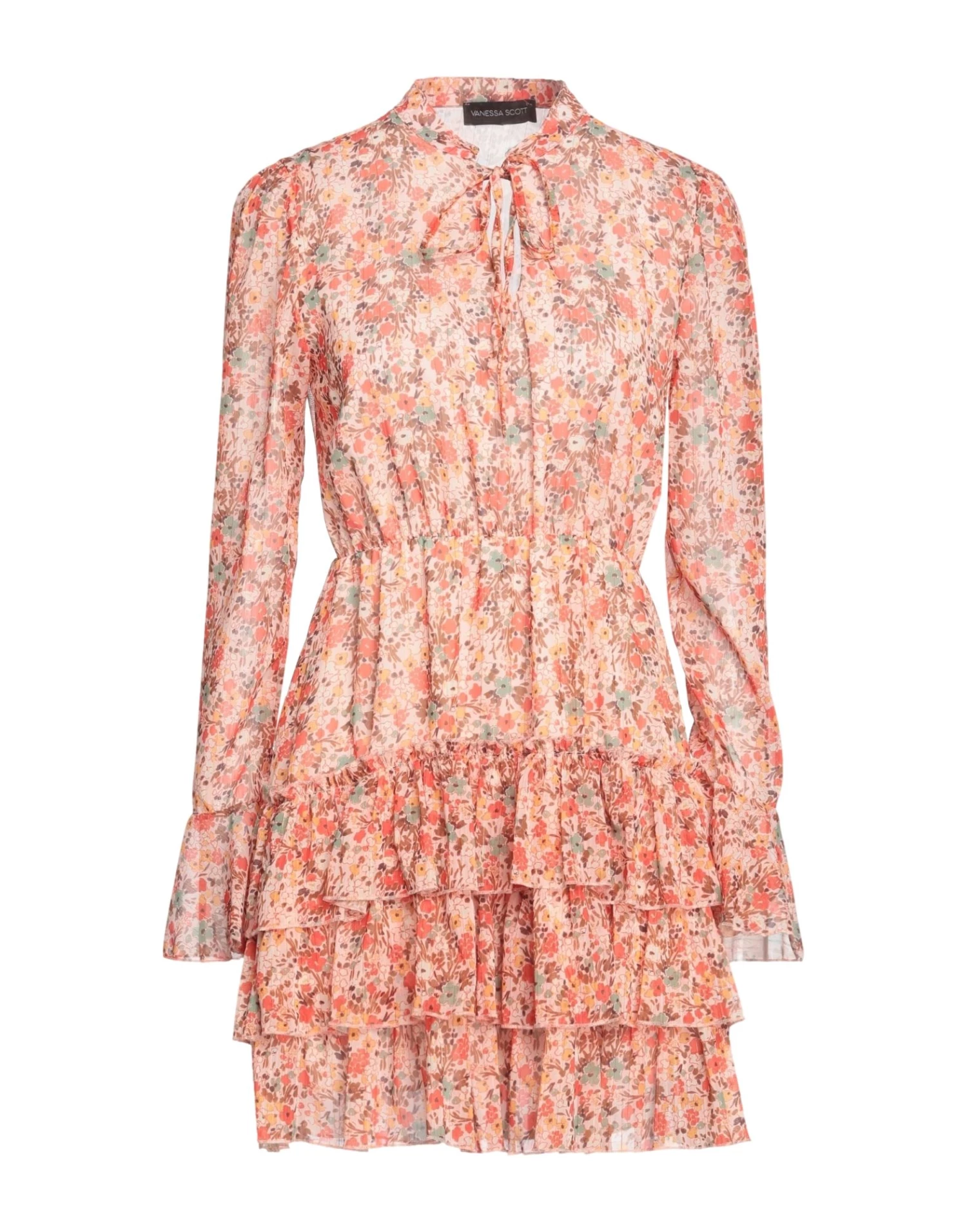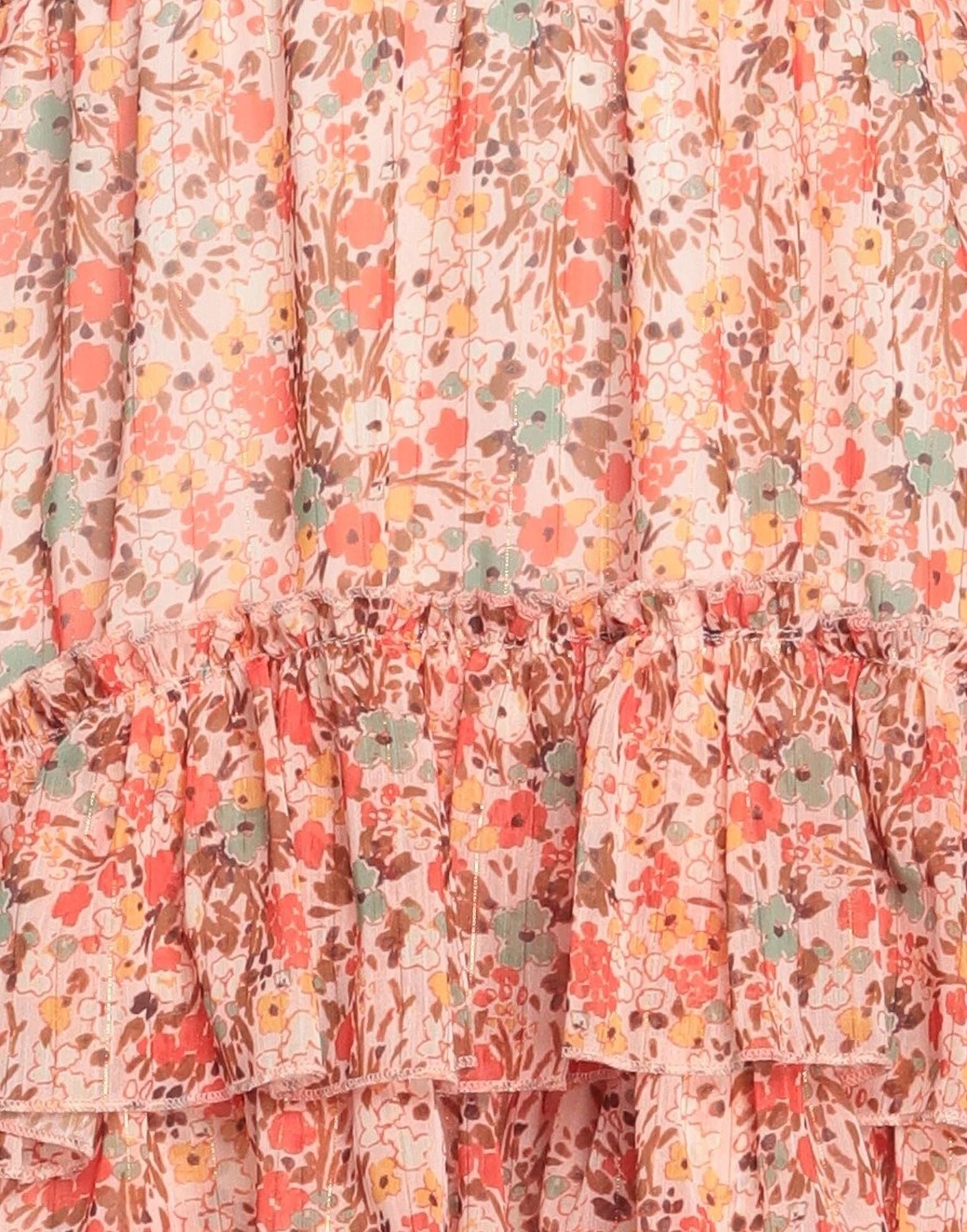 crepe, ruffles, frills, floral design, lamé, bow collar, long sleeves, partially lined interior, no pockets, trapeze style