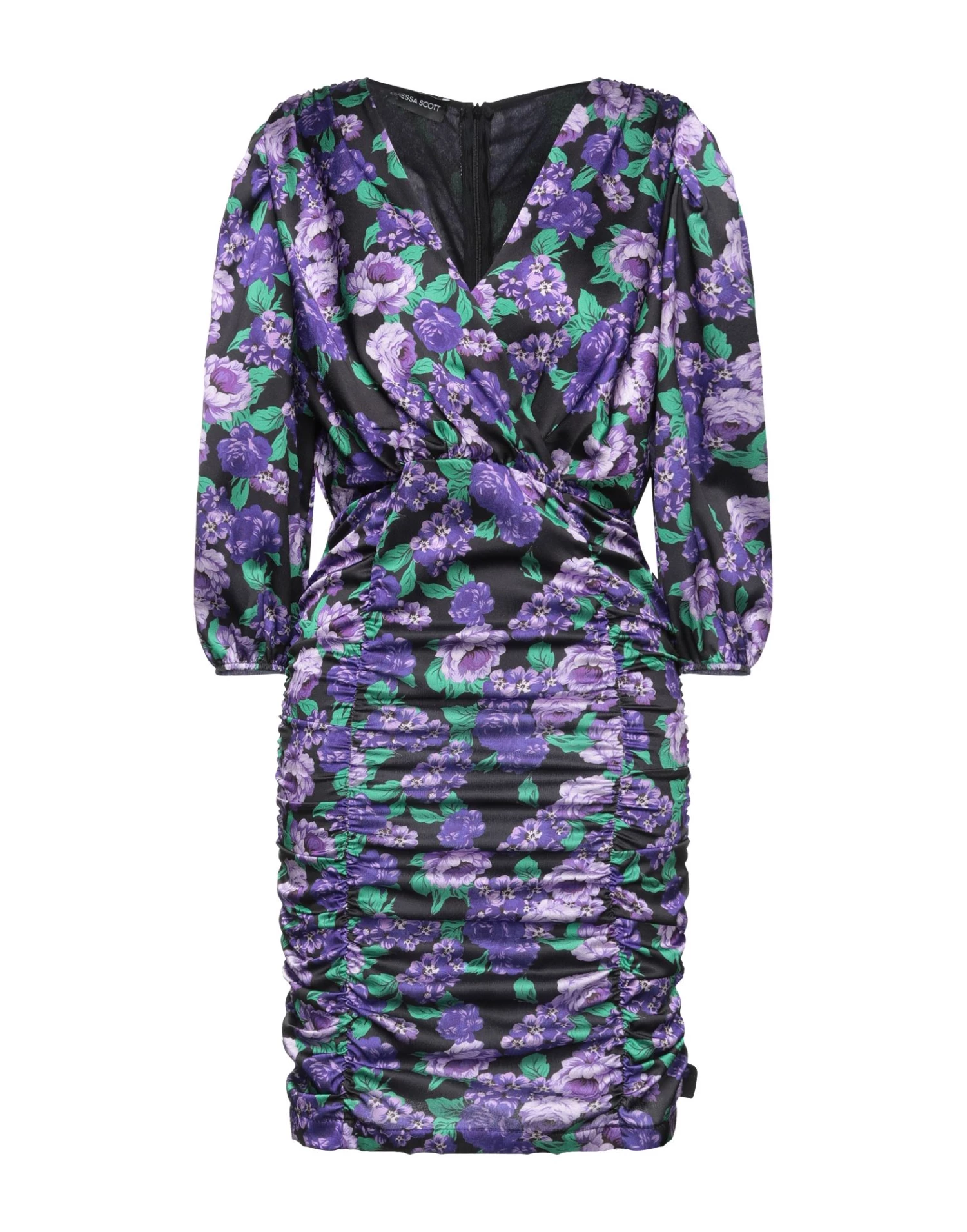 satin, frills, floral design, long sleeves, v-neck, fully lined, no pockets