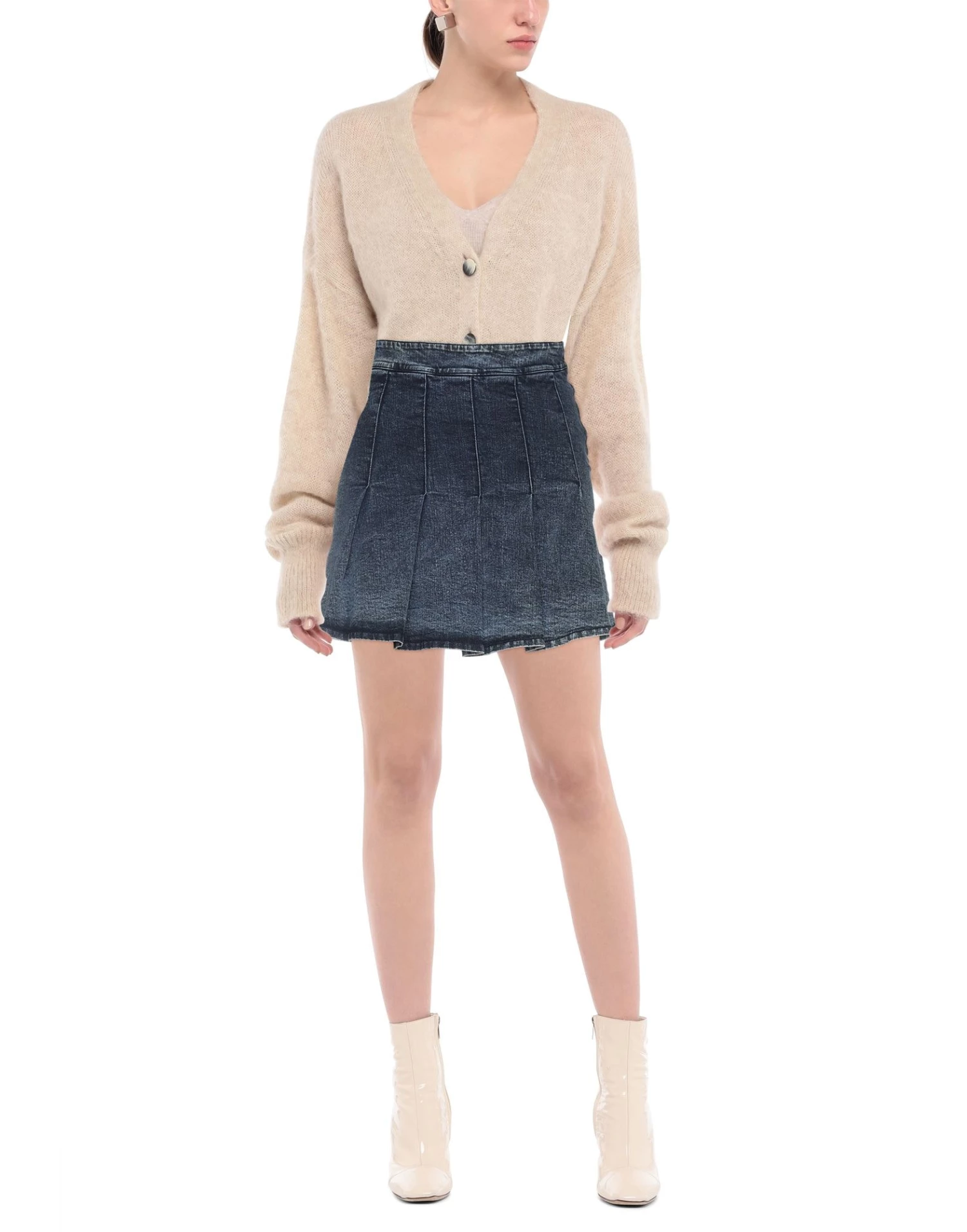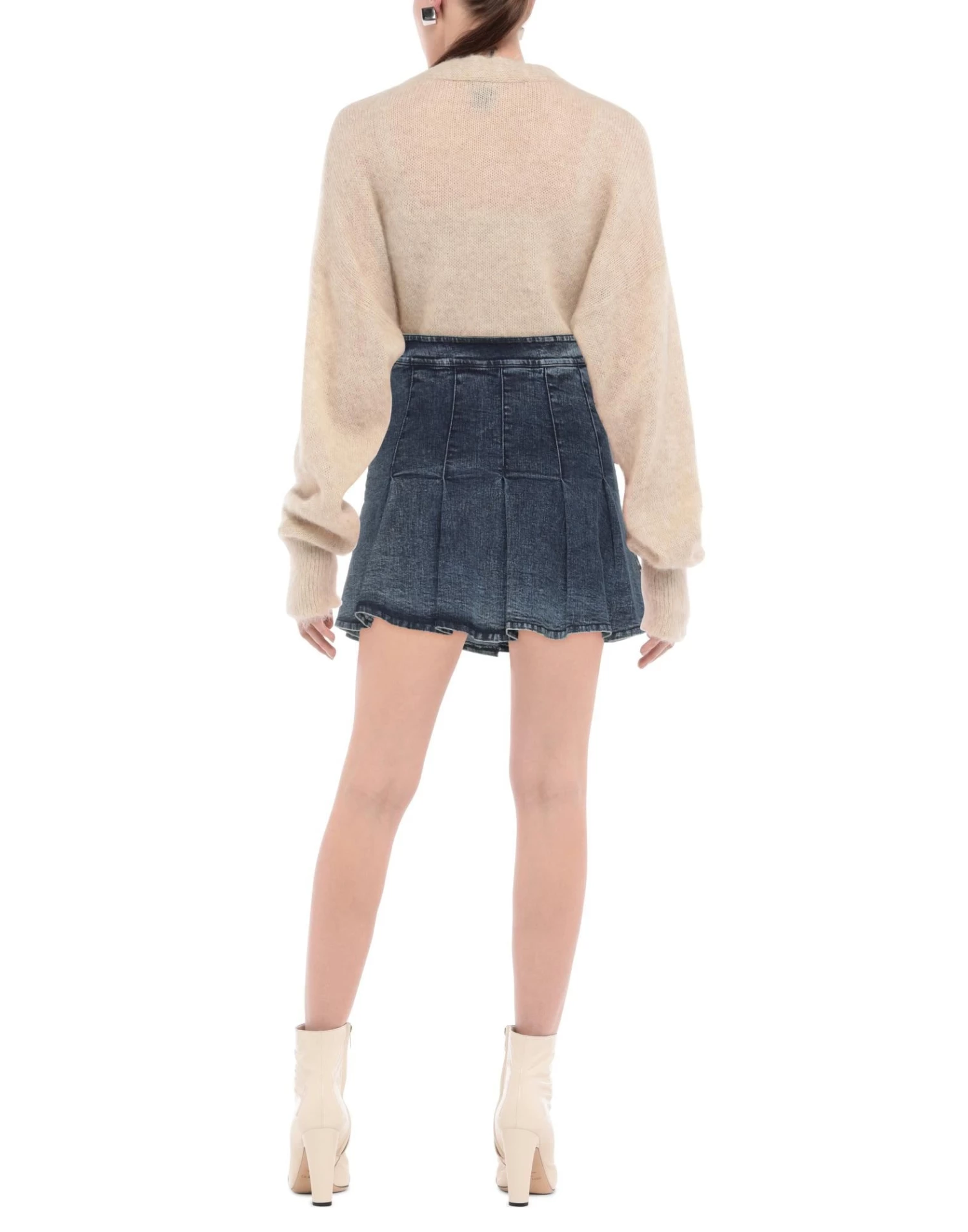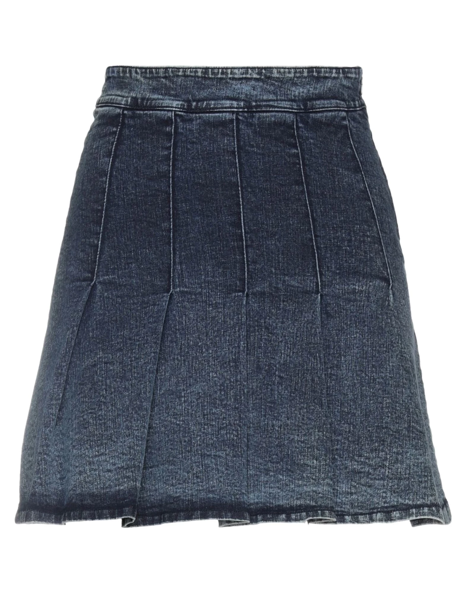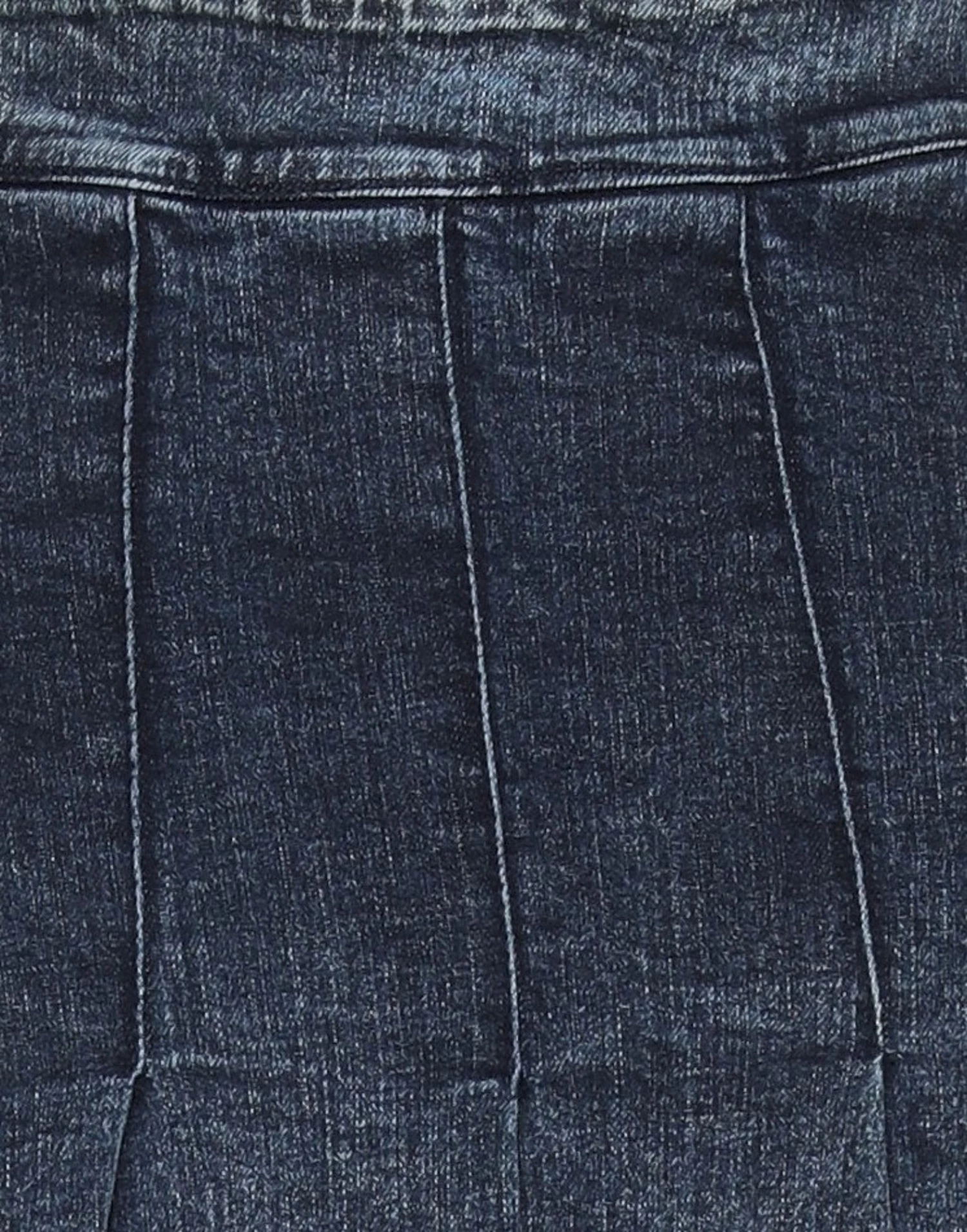 denim, pleated, no appliqués, solid color, unlined, zipper closure, no pockets, stretch, dark wash