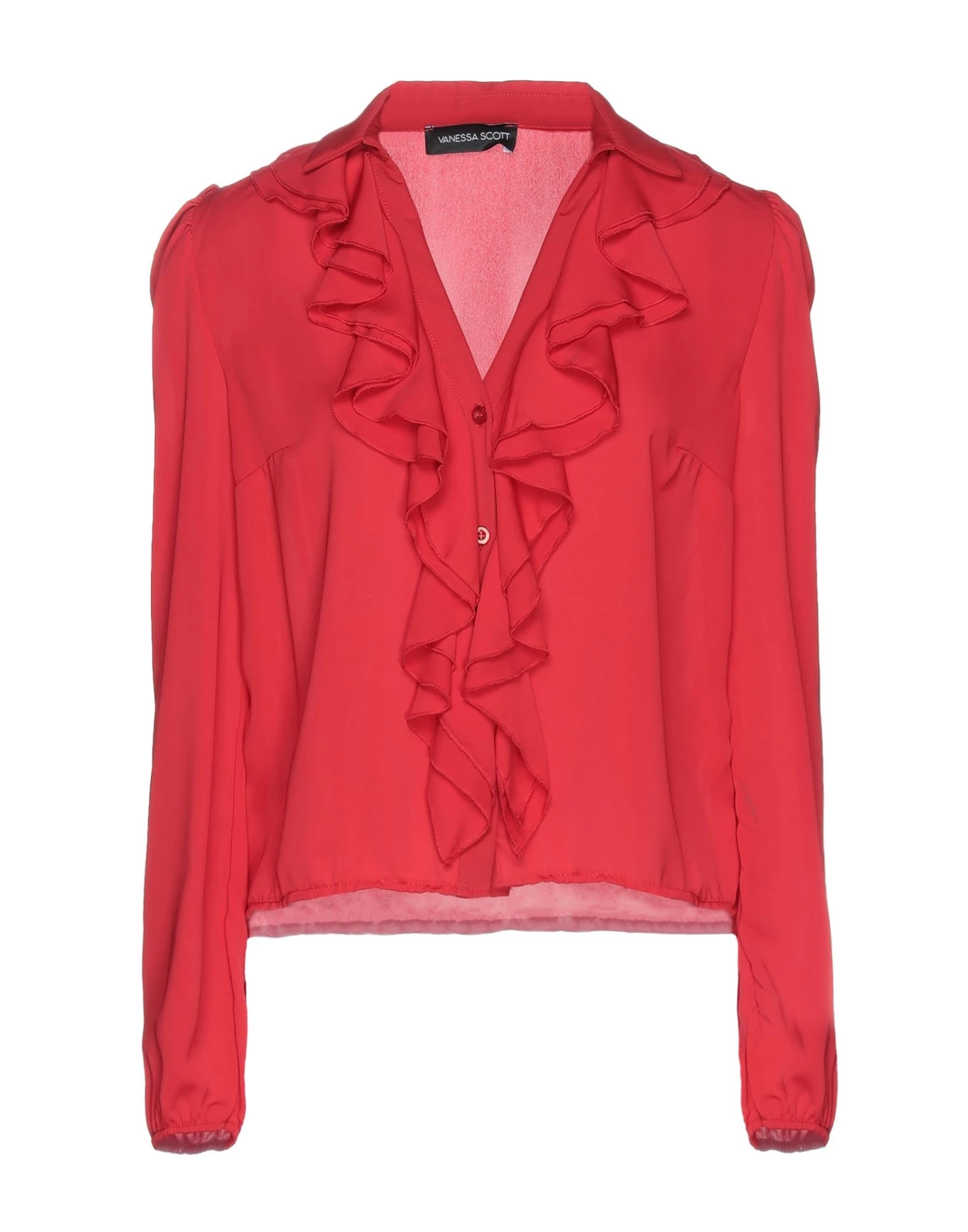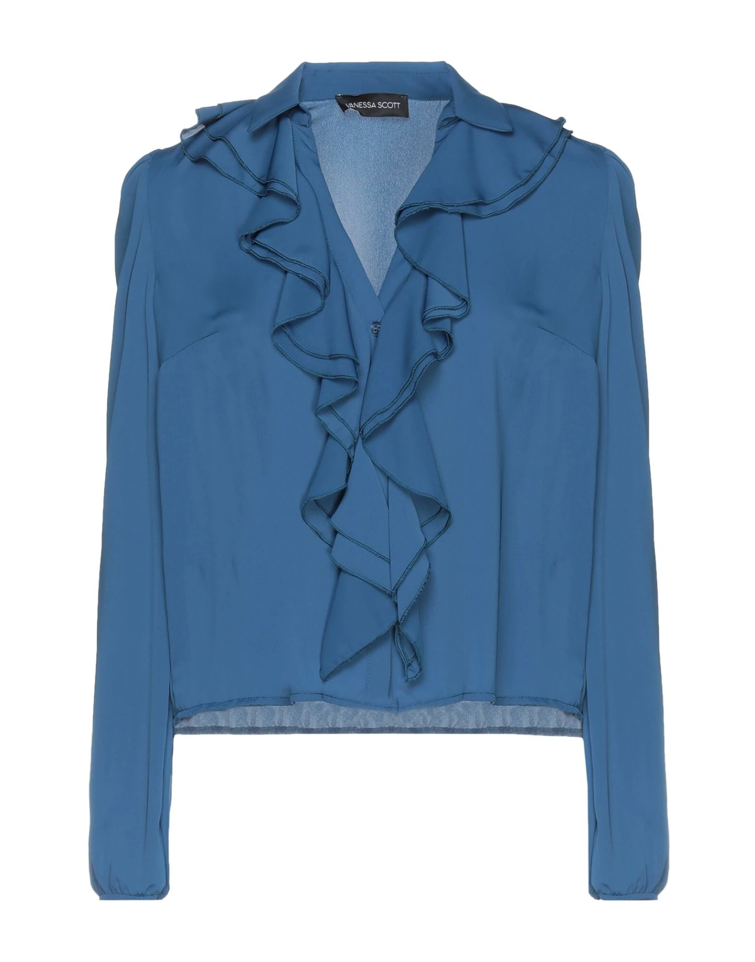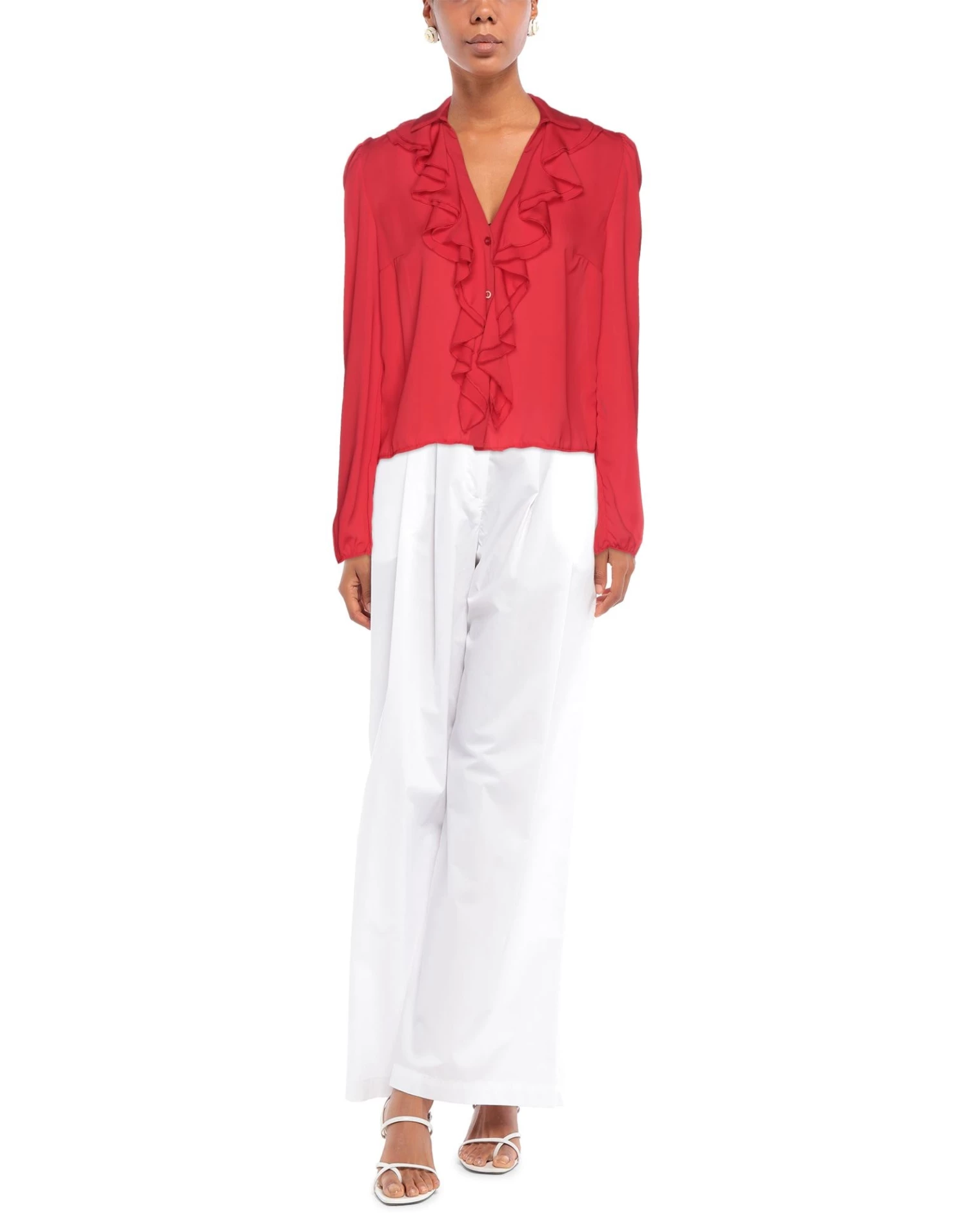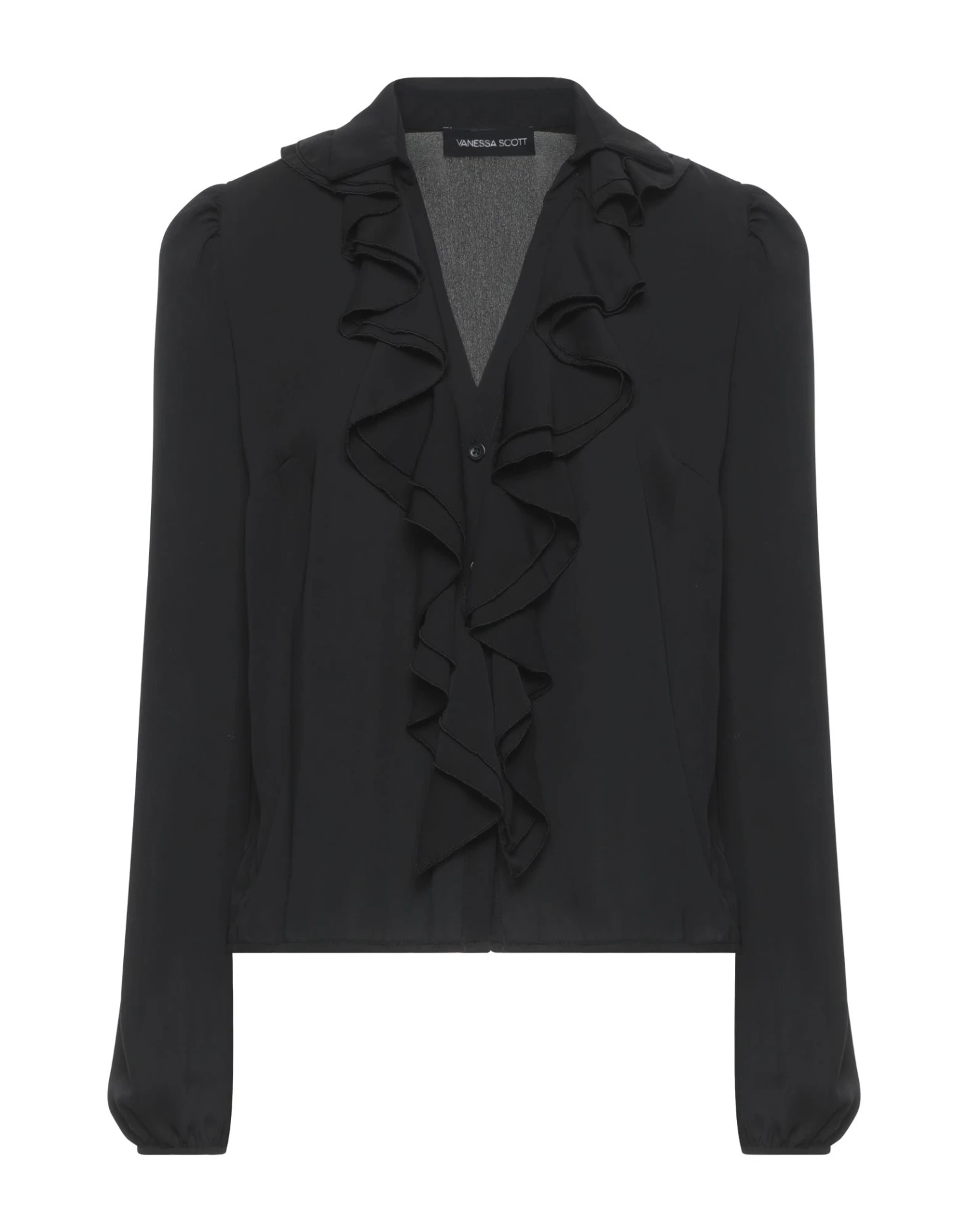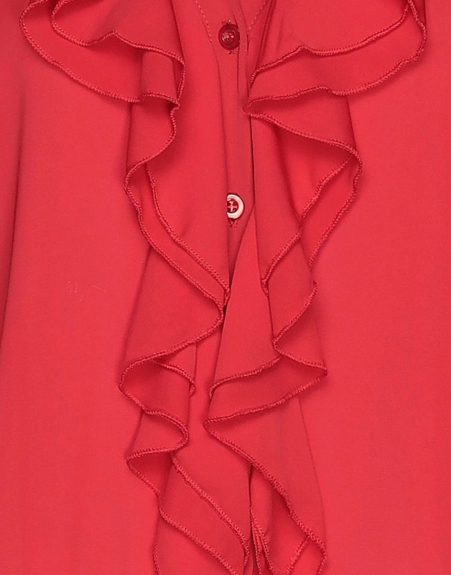 crepe, ruffles, solid color, deep neckline, long sleeves, button closing, no pockets