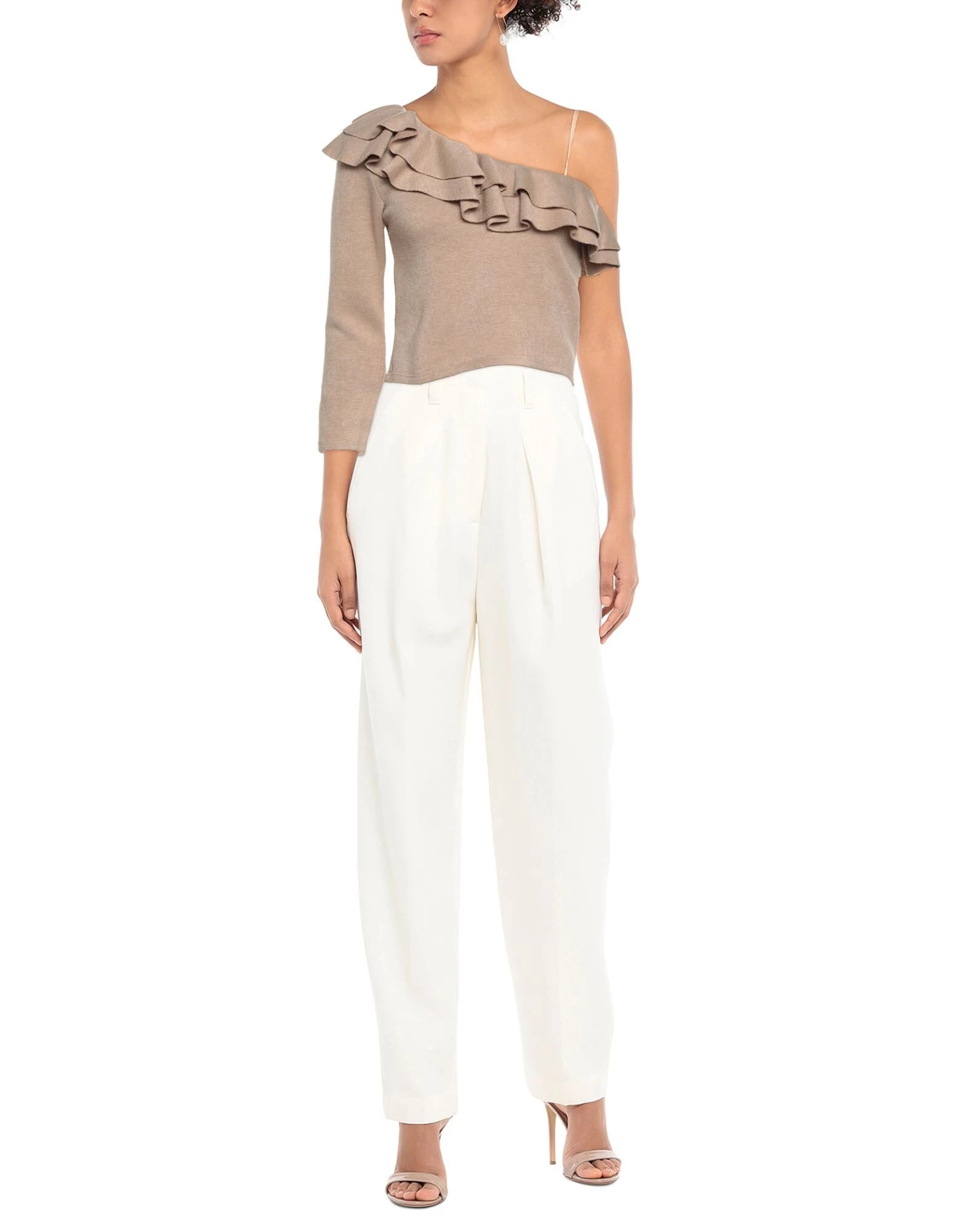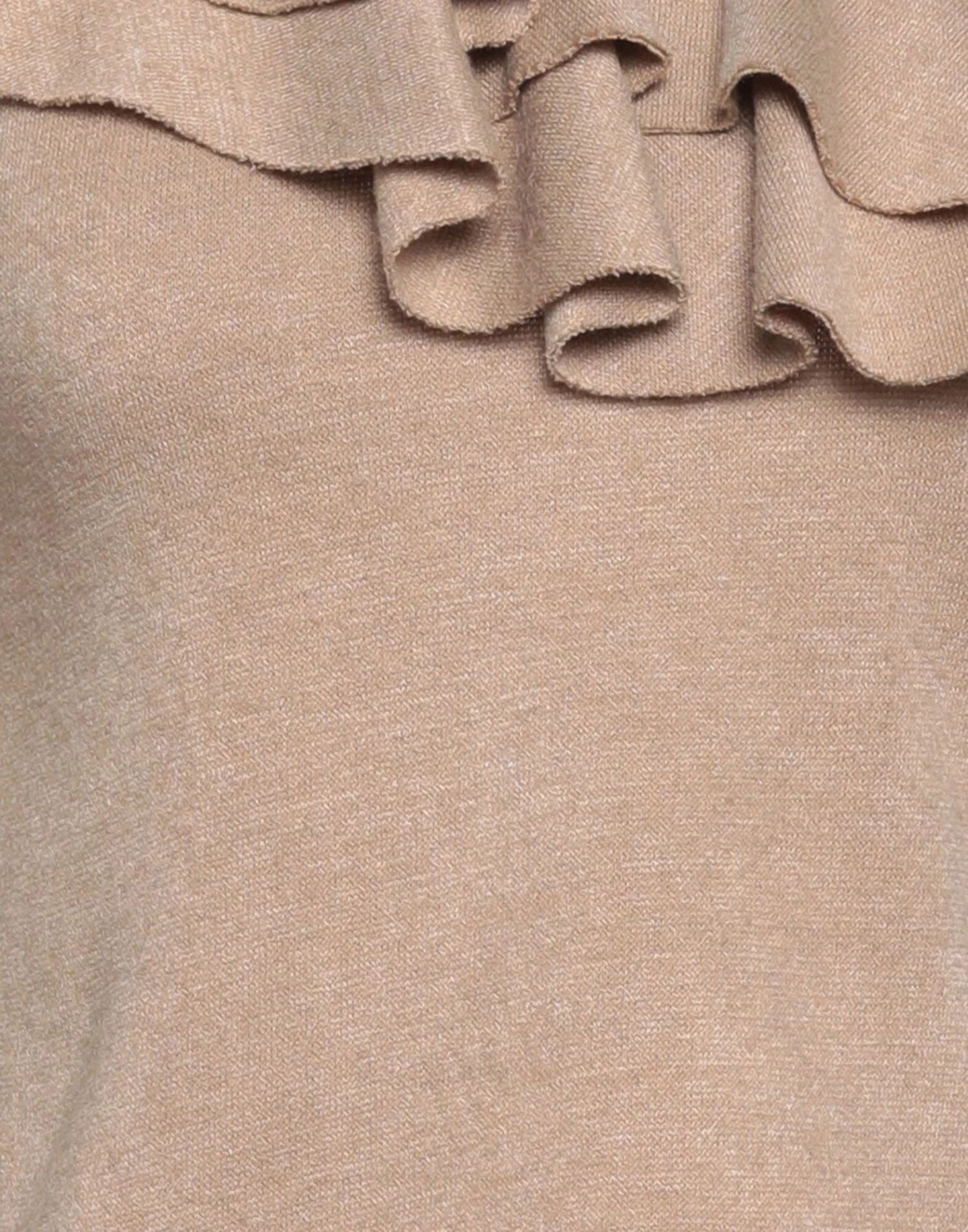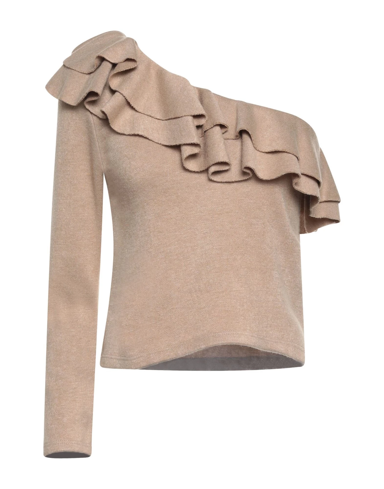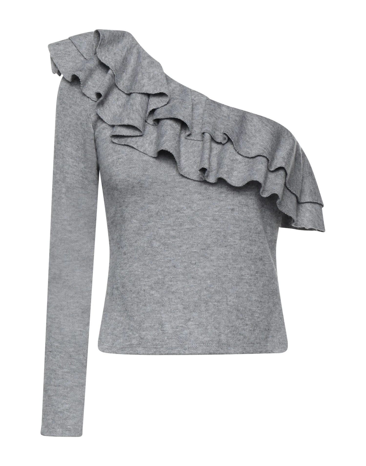 knitted, lightweight knit, ruffles, solid color, wide neckline, one-shoulder, no pockets, mélange