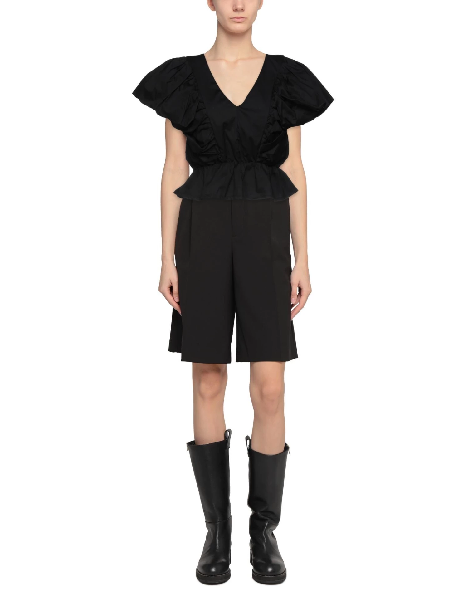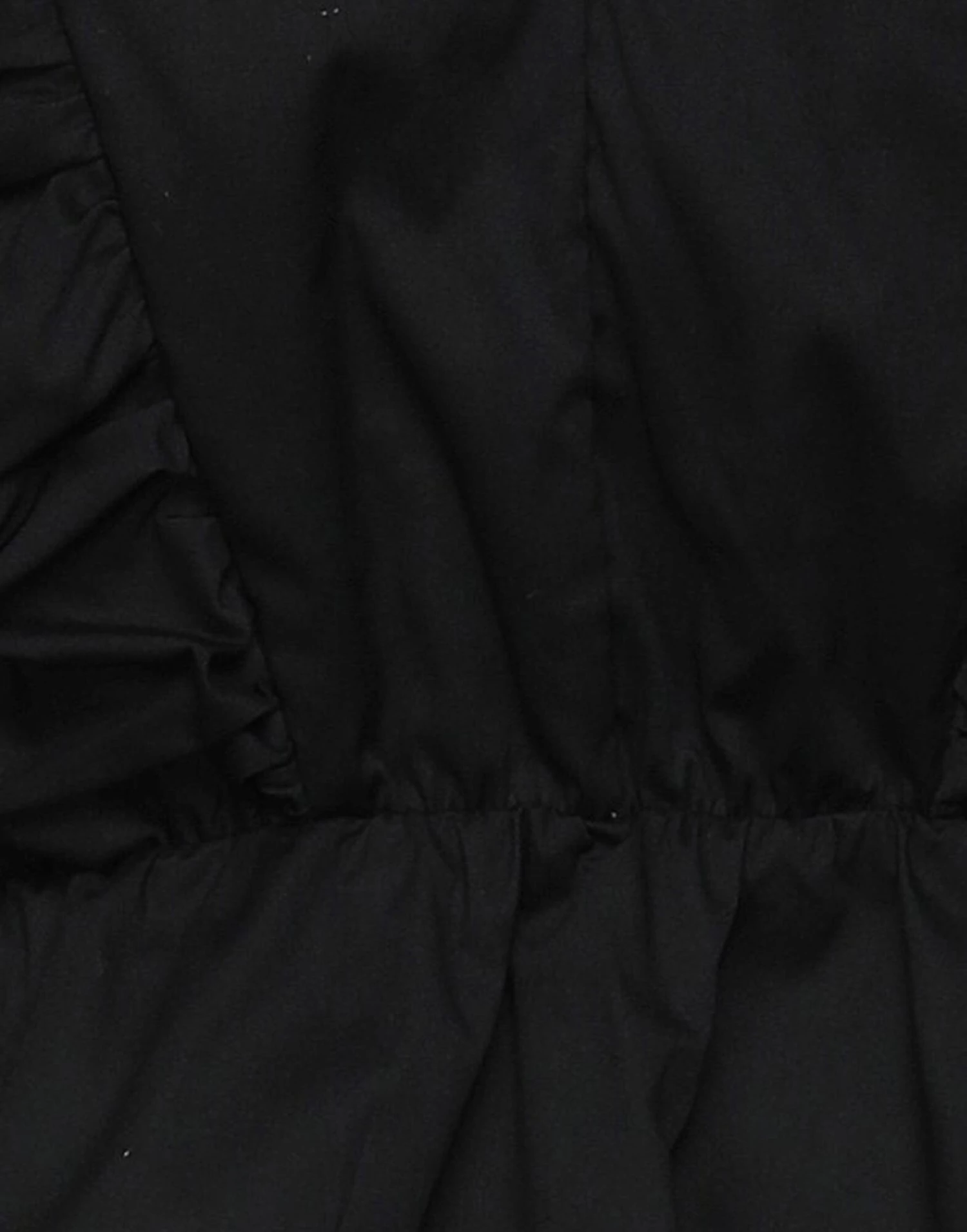 plain weave, frills, solid color, v-neck, short sleeves, no pockets